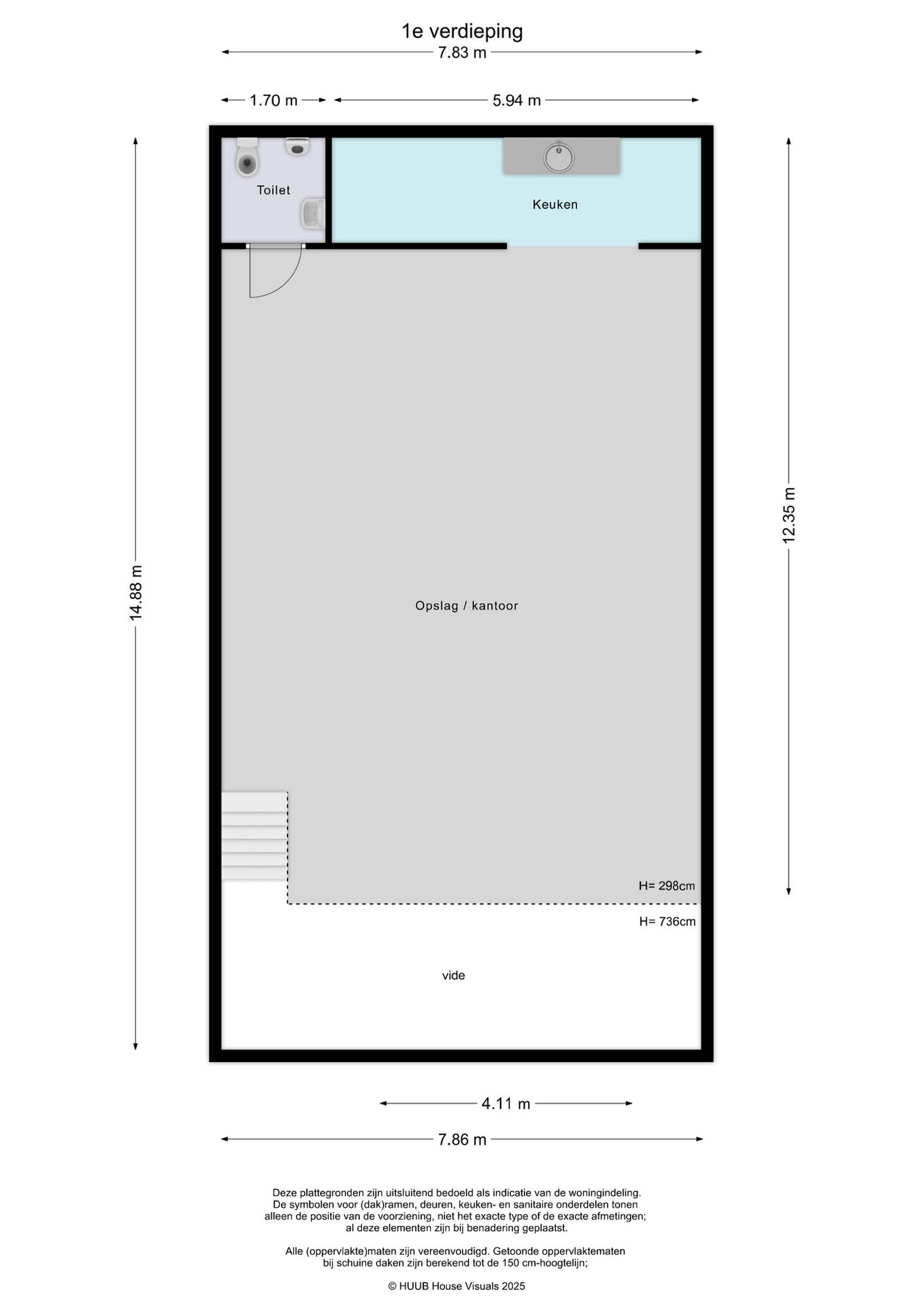 Het object is onderverdeeld in een functionele bedrijfsruimte op de begane grond en een verdieping met opslag, kantoor- en ondersteunende voorzieningen.