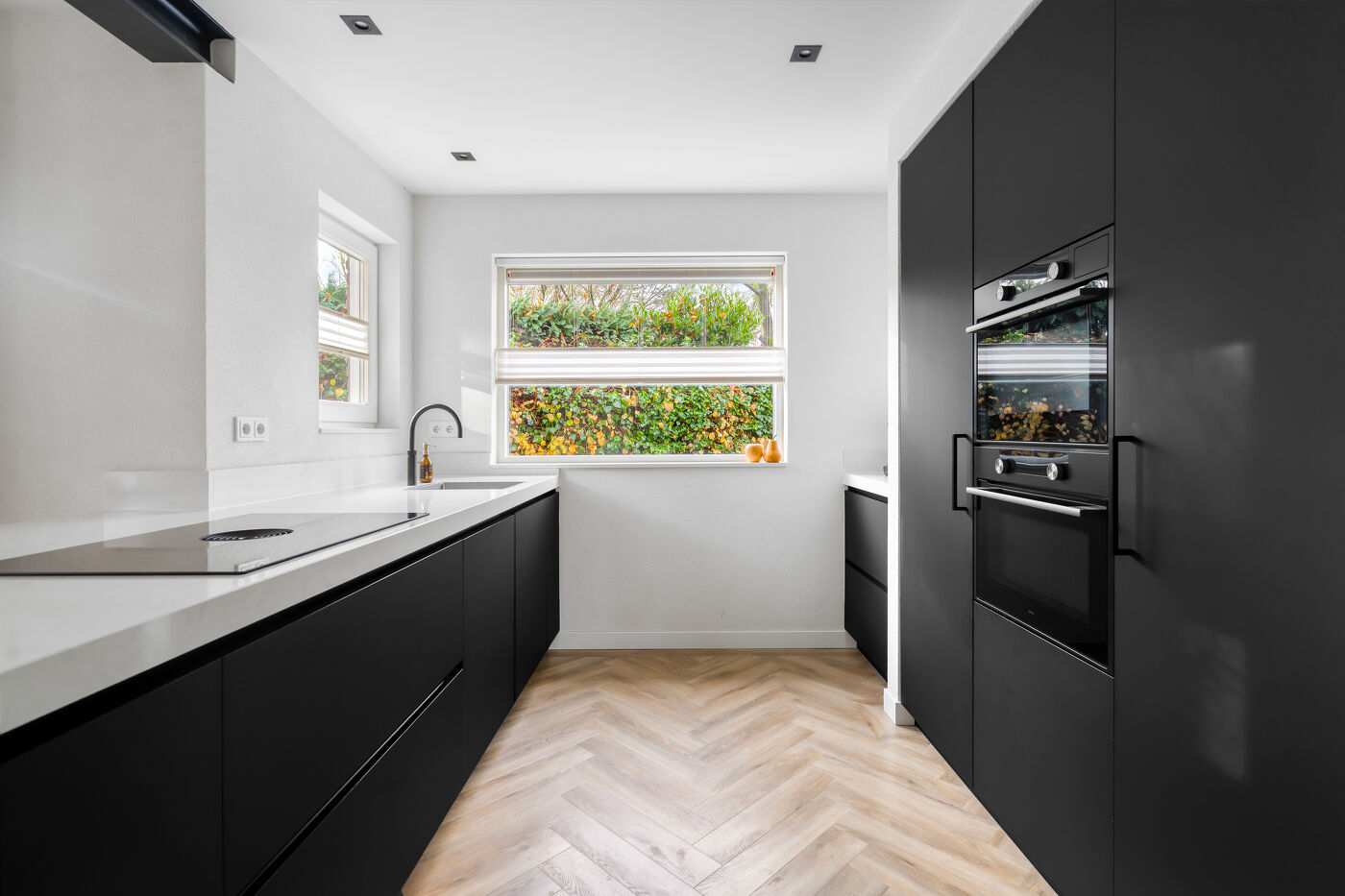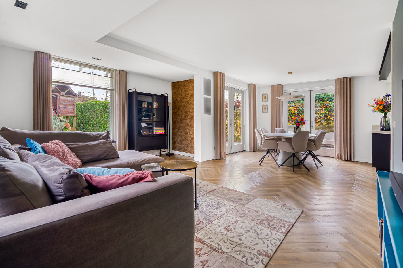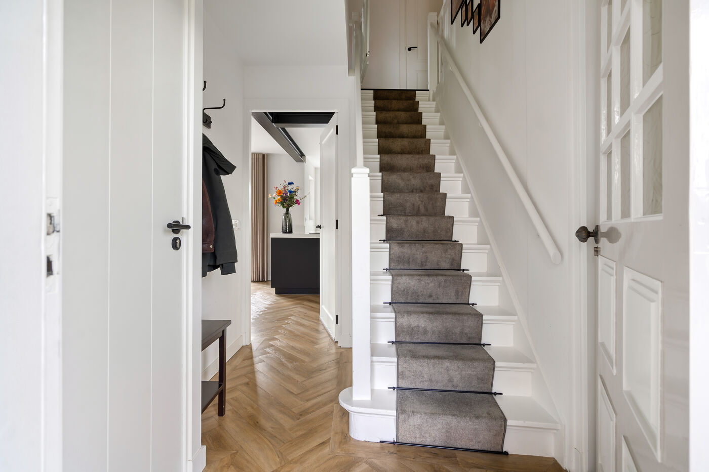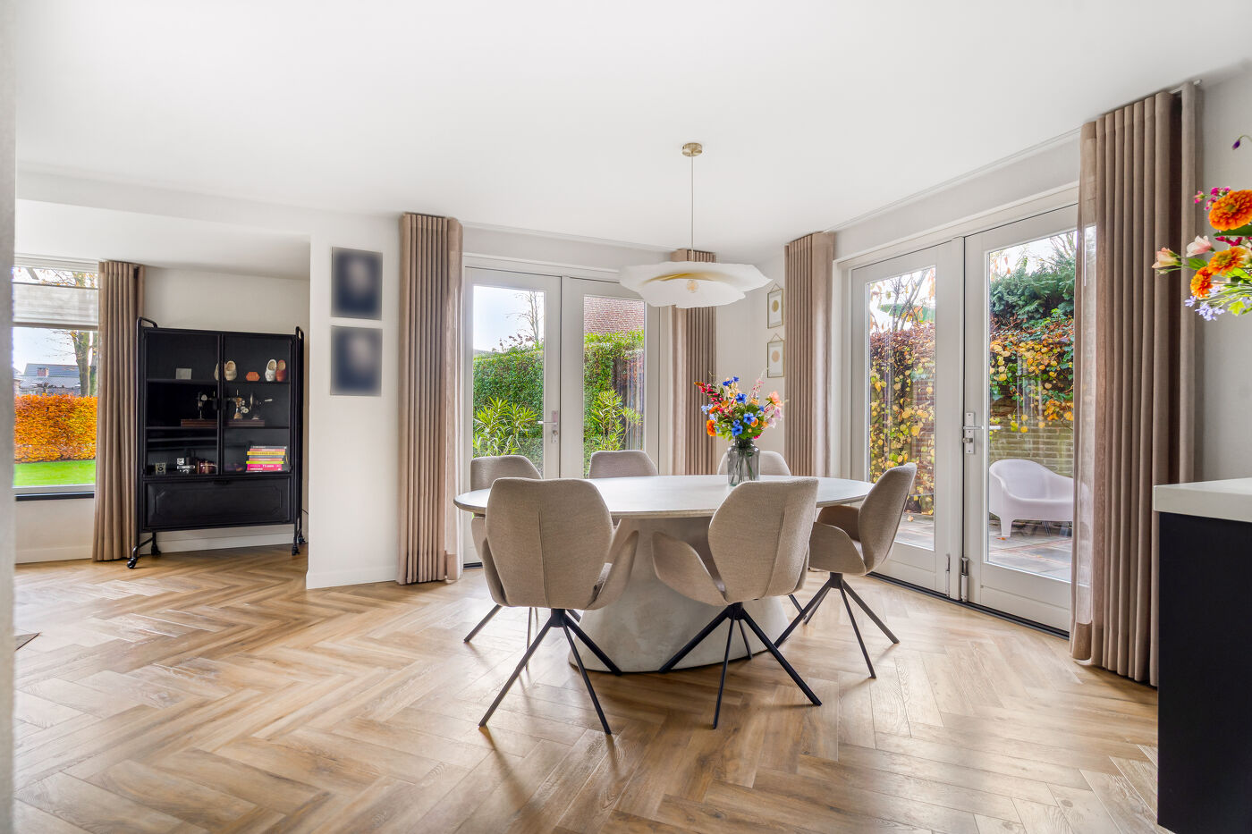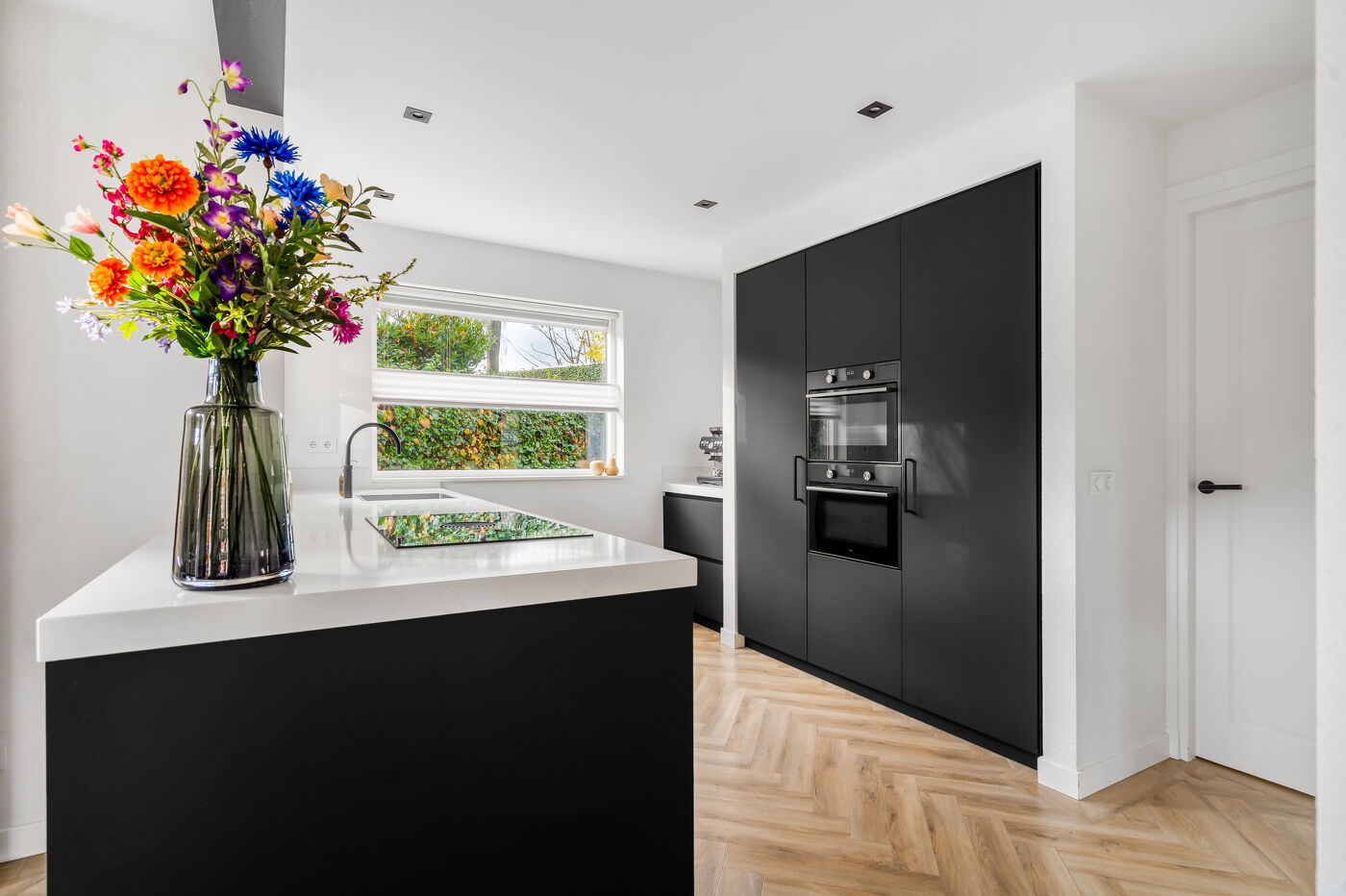 Beneden: De begane grond is in 2020 volledig vernieuwd en geïsoleerd, wat direct zichtbaar is in zowel de afwerking als het wooncomfort. Via de entree kom je binnen in de hal met meterkast en deuren naar de woonkamer en de werk-/speelkamer. De lichte, ruime woonkamer heeft grote raampartijen en dubbele tuindeuren, waardoor er volop contact is met de fraai aangelegde tuin. De sfeervolle zit- en eethoek lopen naadloos in elkaar over en de visgraatvloer met vloerverwarming geeft het geheel een warme, luxe uitstraling.