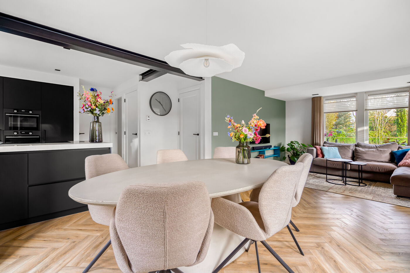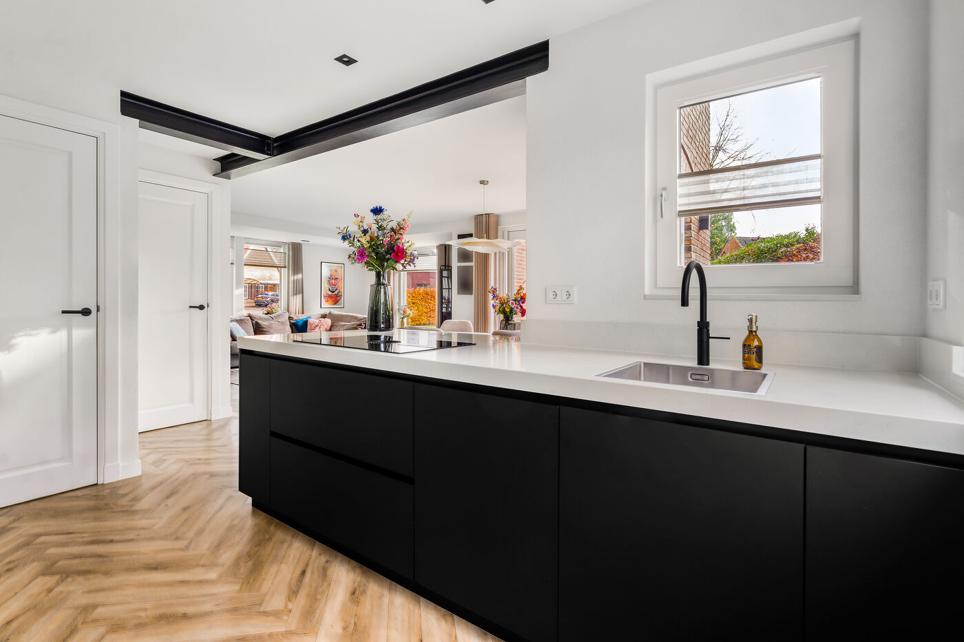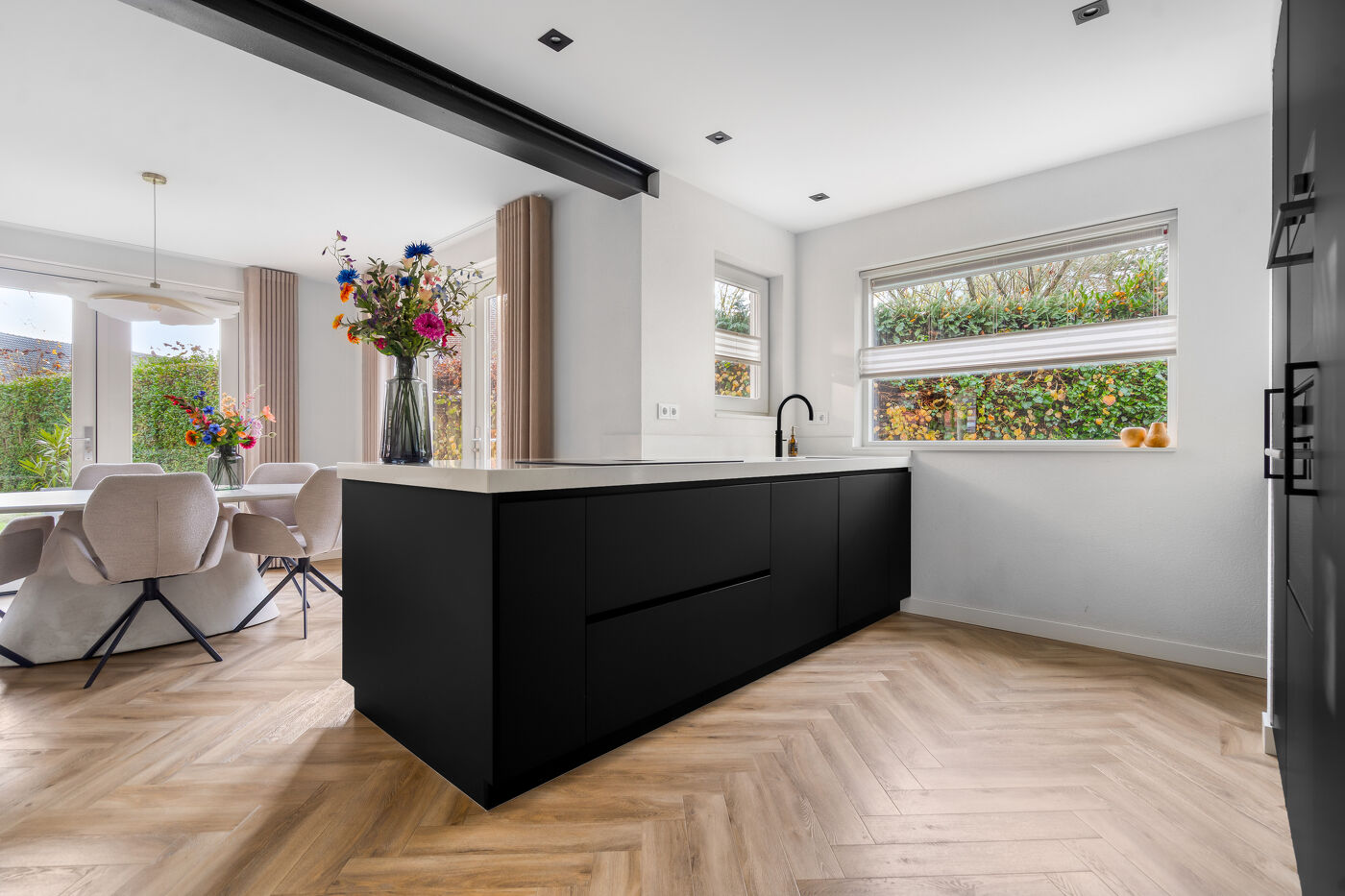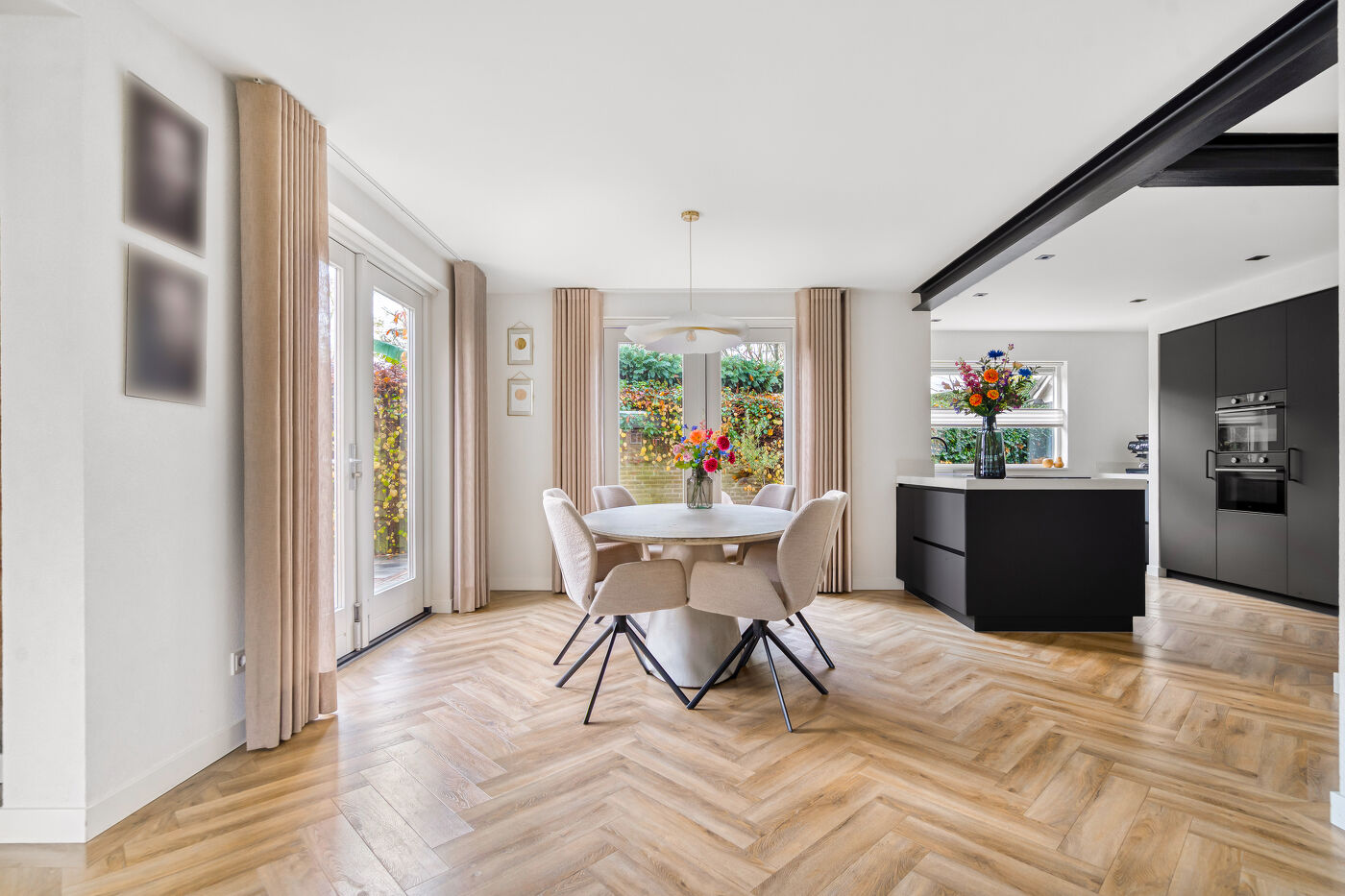Beneden: De begane grond is in 2020 volledig vernieuwd en geïsoleerd, wat direct zichtbaar is in zowel de afwerking als het wooncomfort. Via de entree kom je binnen in de hal met meterkast en deuren naar de woonkamer en de werk-/speelkamer. De lichte, ruime woonkamer heeft grote raampartijen en dubbele tuindeuren, waardoor er volop contact is met de fraai aangelegde tuin. De sfeervolle zit- en eethoek lopen naadloos in elkaar over en de visgraatvloer met vloerverwarming geeft het geheel een warme, luxe uitstraling.