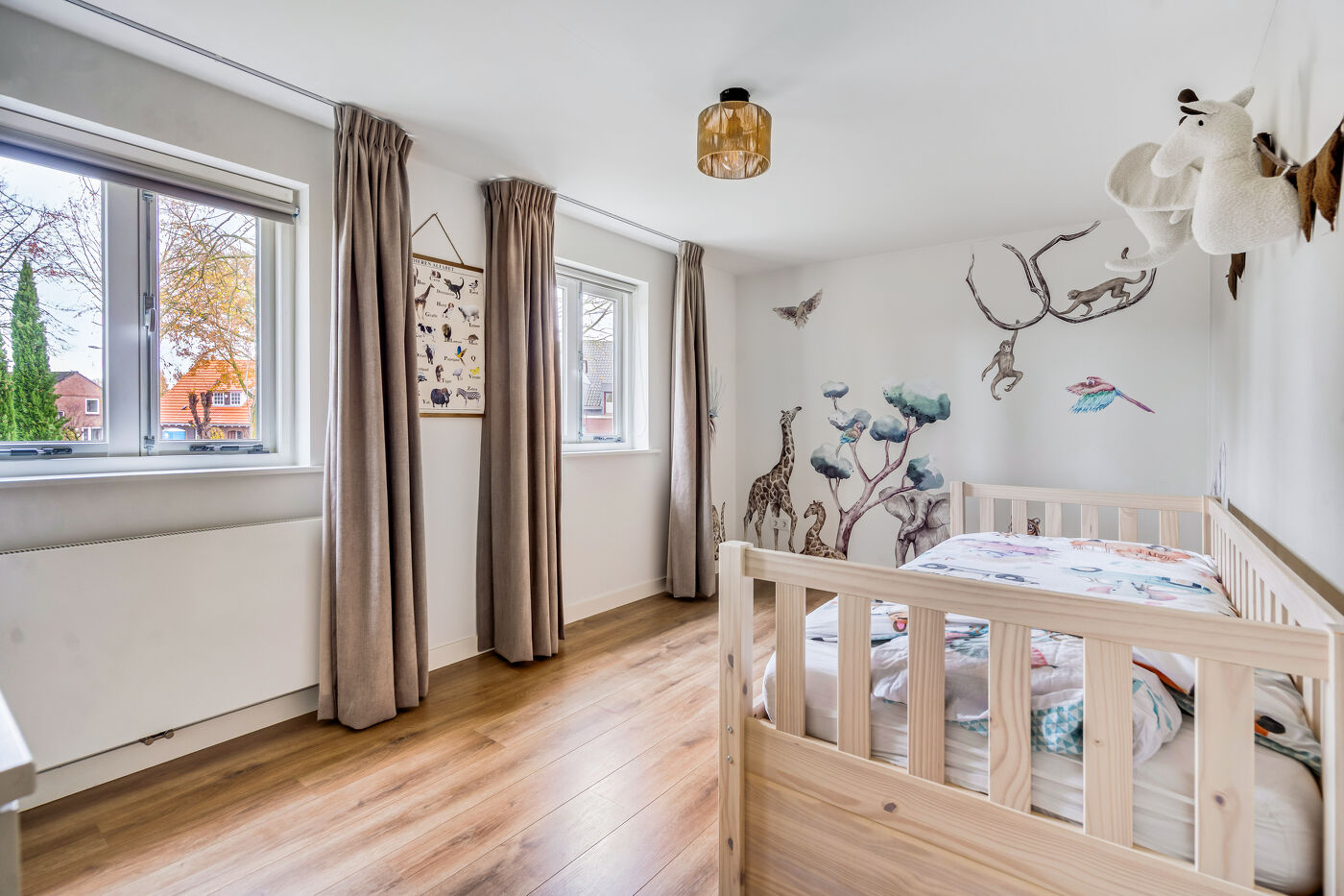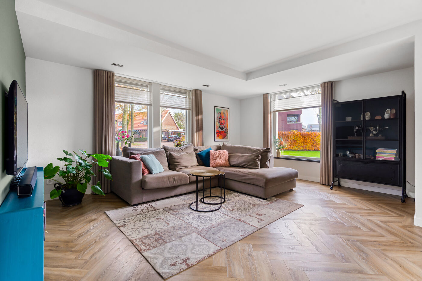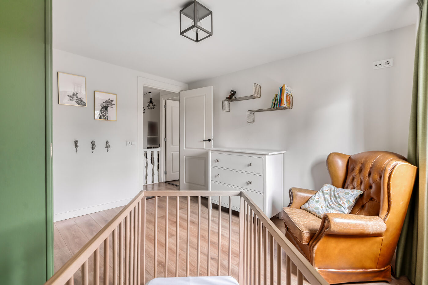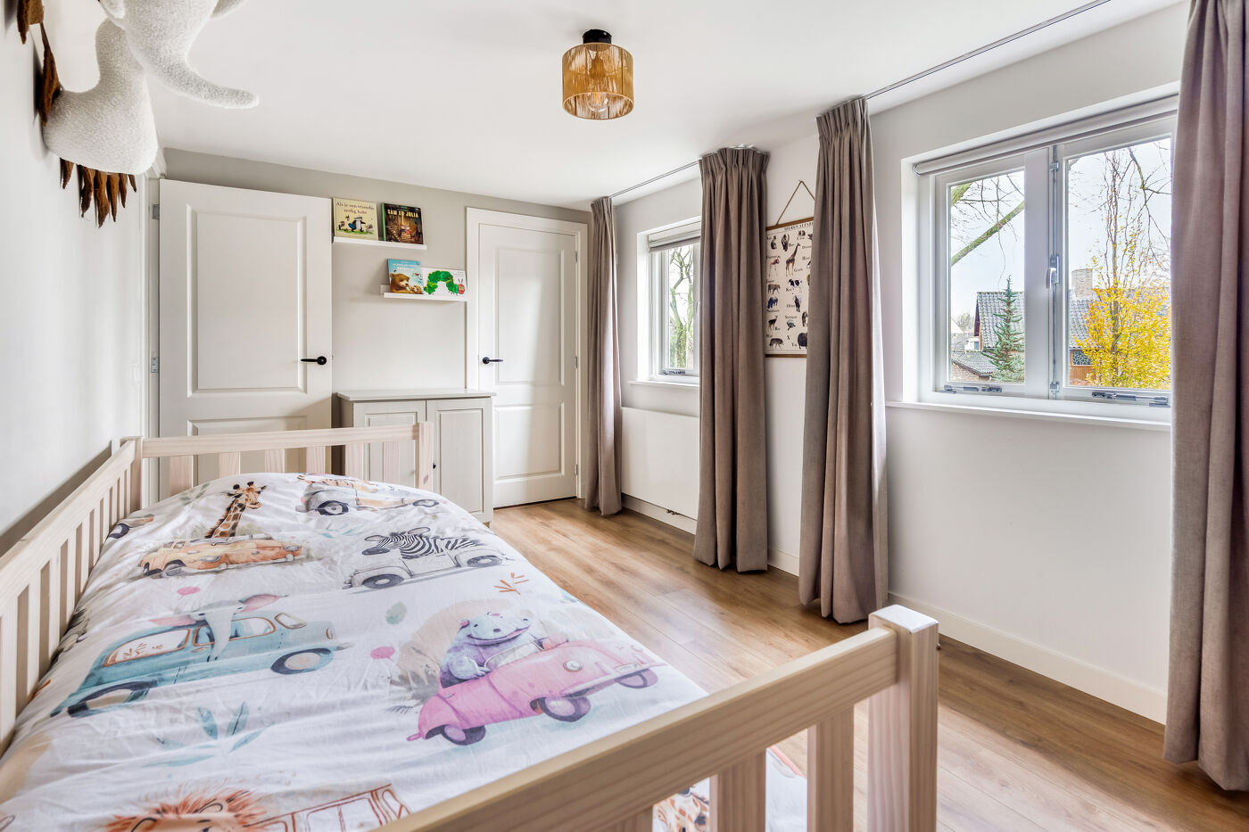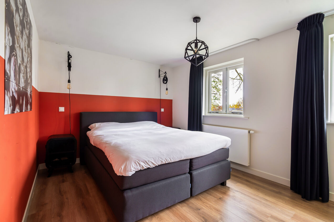 Beneden: De begane grond is in 2020 volledig vernieuwd en geïsoleerd, wat direct zichtbaar is in zowel de afwerking als het wooncomfort. Via de entree kom je binnen in de hal met meterkast en deuren naar de woonkamer en de werk-/speelkamer. De lichte, ruime woonkamer heeft grote raampartijen en dubbele tuindeuren, waardoor er volop contact is met de fraai aangelegde tuin. De sfeervolle zit- en eethoek lopen naadloos in elkaar over en de visgraatvloer met vloerverwarming geeft het geheel een warme, luxe uitstraling.