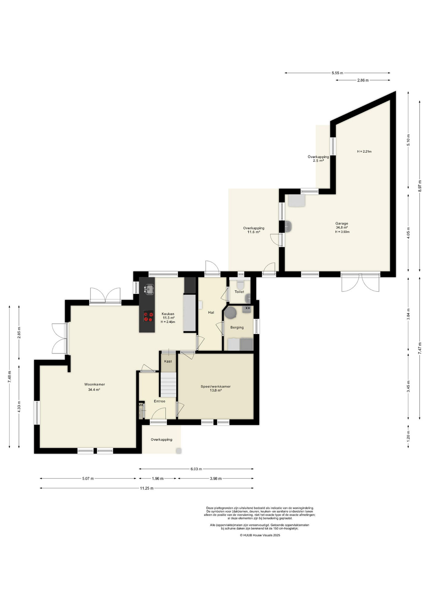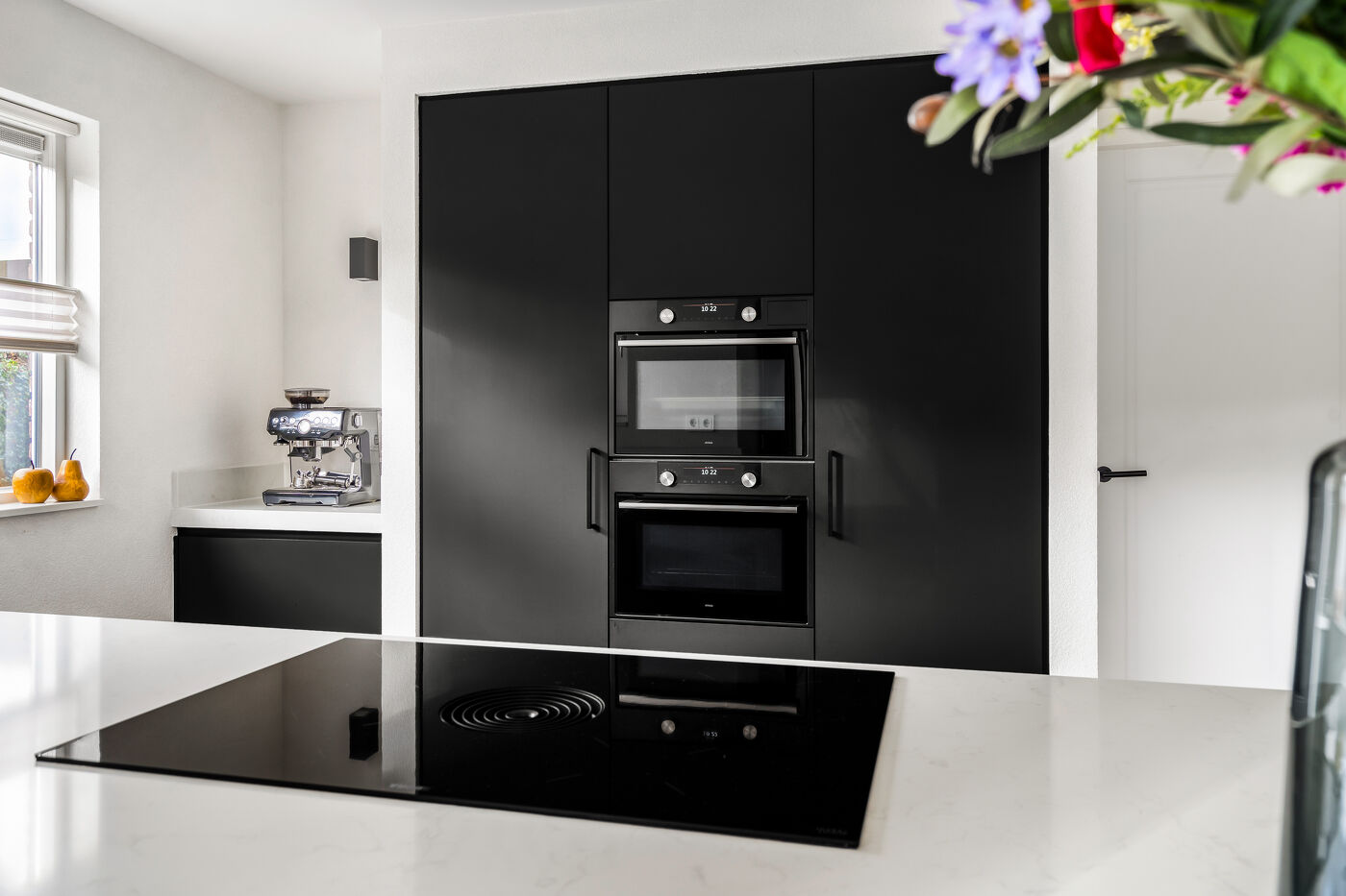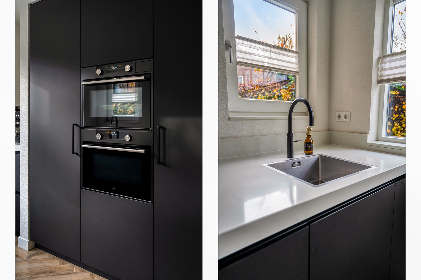 Aan de achterzijde ligt de strakke, moderne keuken, voorzien van hoogwaardige apparatuur zoals een inductiekookplaat met geïntegreerde afzuiging, Quooker, stoomoven, combi-oven/magnetron, koelkast en vaatwasser. Dankzij de ramen aan twee zijden geniet je hier van veel licht en een mooi uitzicht op de tuin. Vanuit zowel de keuken als de hal bereik je de ruime werk-/speelkamer van ca. 14 m². Met de grote ramen en veelzijdige indeling is deze ruimte ideaal als thuiswerkplek, speelkamer of zelfs slaapkamer op de begane grond.