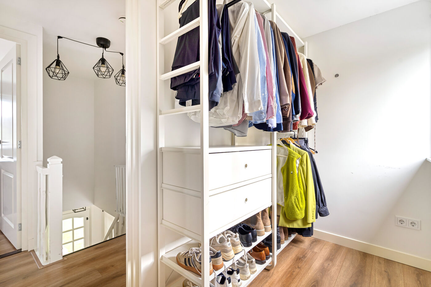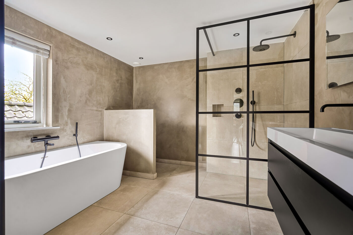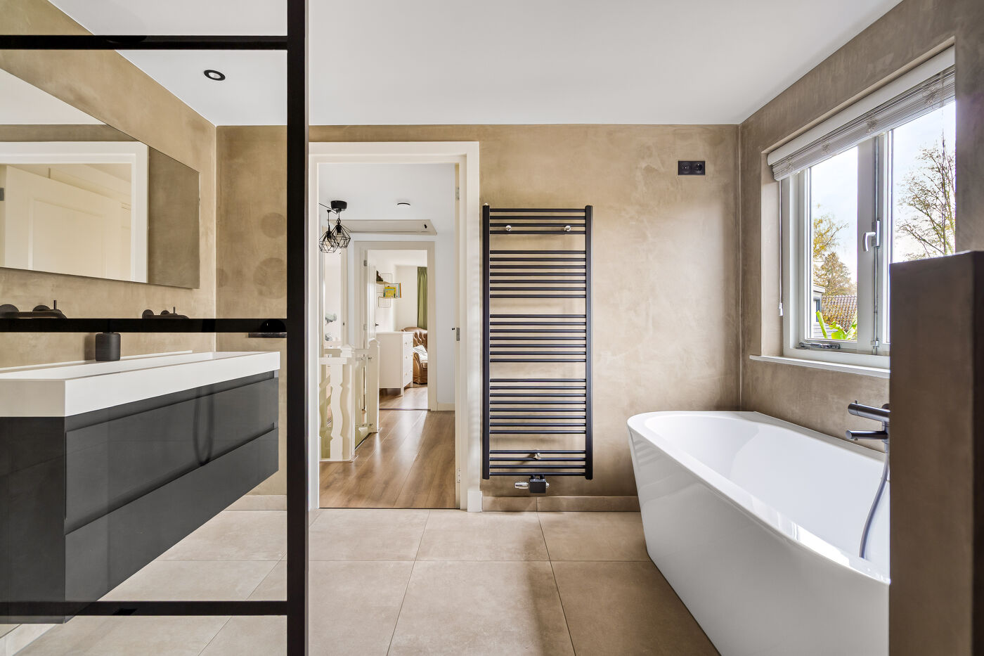 Boven: De overloop geeft toegang tot drie ruime slaapkamers en een vierde, kleinere kamer die momenteel in gebruik is als inloopkast, maar ook prima als slaapkamer kan dienen. Deze indeling biedt diverse mogelijkheden voor gezinnen, thuiswerkers of logees. De moderne badkamer uit 2018 is stijlvol afgewerkt in rustige, natuurlijke tinten en uitgerust met een royale inloopdouche met glazen wand, een modern ligbad, een wastafel met meubel, een toilet en een designradiator. Via een vlizotrap bereik je de ruime bergzolder.