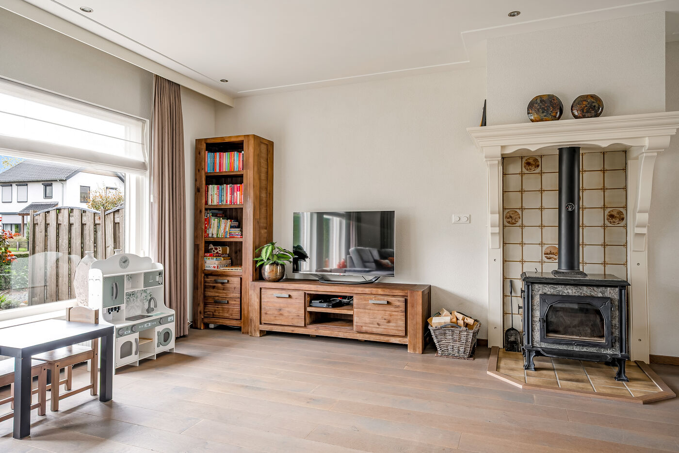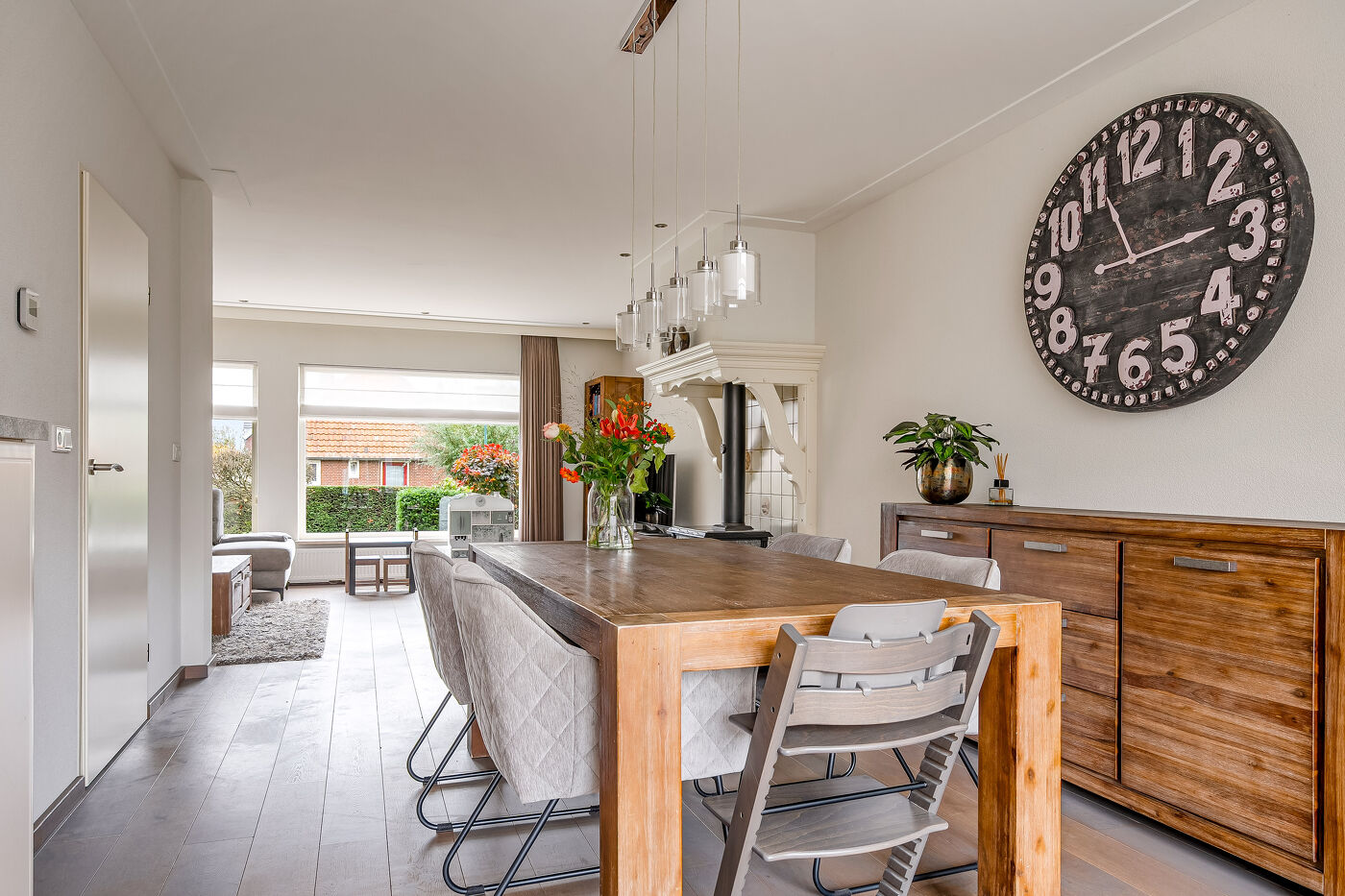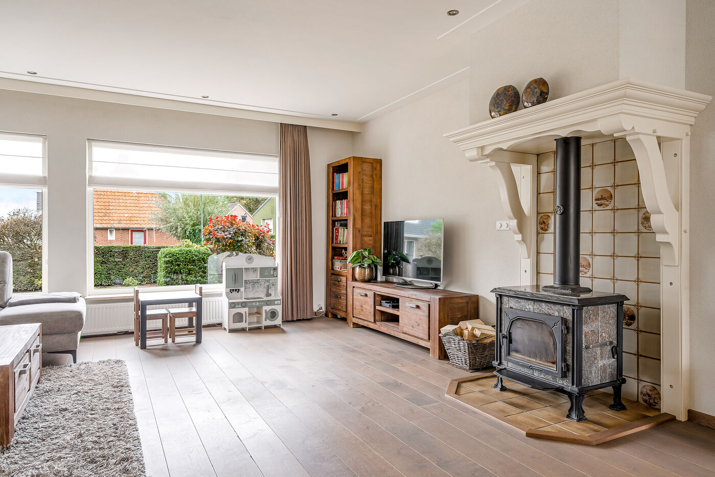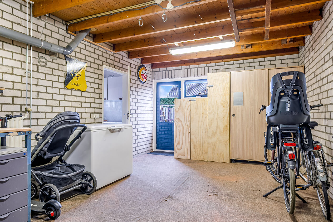 Begane grond: Je komt binnen in de hal met meterkast en een modern toilet. De ruime woonkamer is licht en sfeervol, voorzien van een gezellige speksteenkachel. Aansluitend bevindt zich de eethoek met de open keuken. Deze keuken is in de loop der jaren keurig onderhouden en voorzien van diverse inbouwapparatuur, waaronder een koelkast, keramische kookplaat, combi-oven, vaatwasser en afzuigkap. Vanuit zowel de woonkamer als de keuken heb je uitzicht op de diepe, zonnige achtertuin. Grenzend aan de keuken ligt de praktische bijkeuken met aansluitingen voor wasmachine en droger. Vanuit hier bereik je de achtertuin of loop je direct door naar de inpandige garage, die is voorzien van elektra en verwarming en beschikt over een ruime bergzolder van circa 22 m², ideaal als opslag- of hobbyruimte.