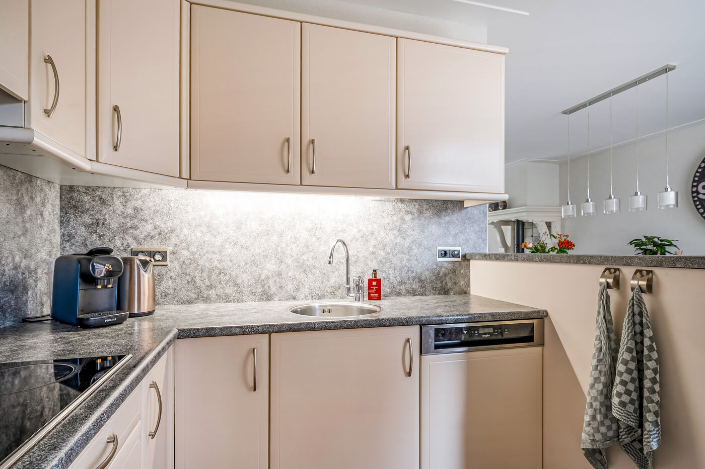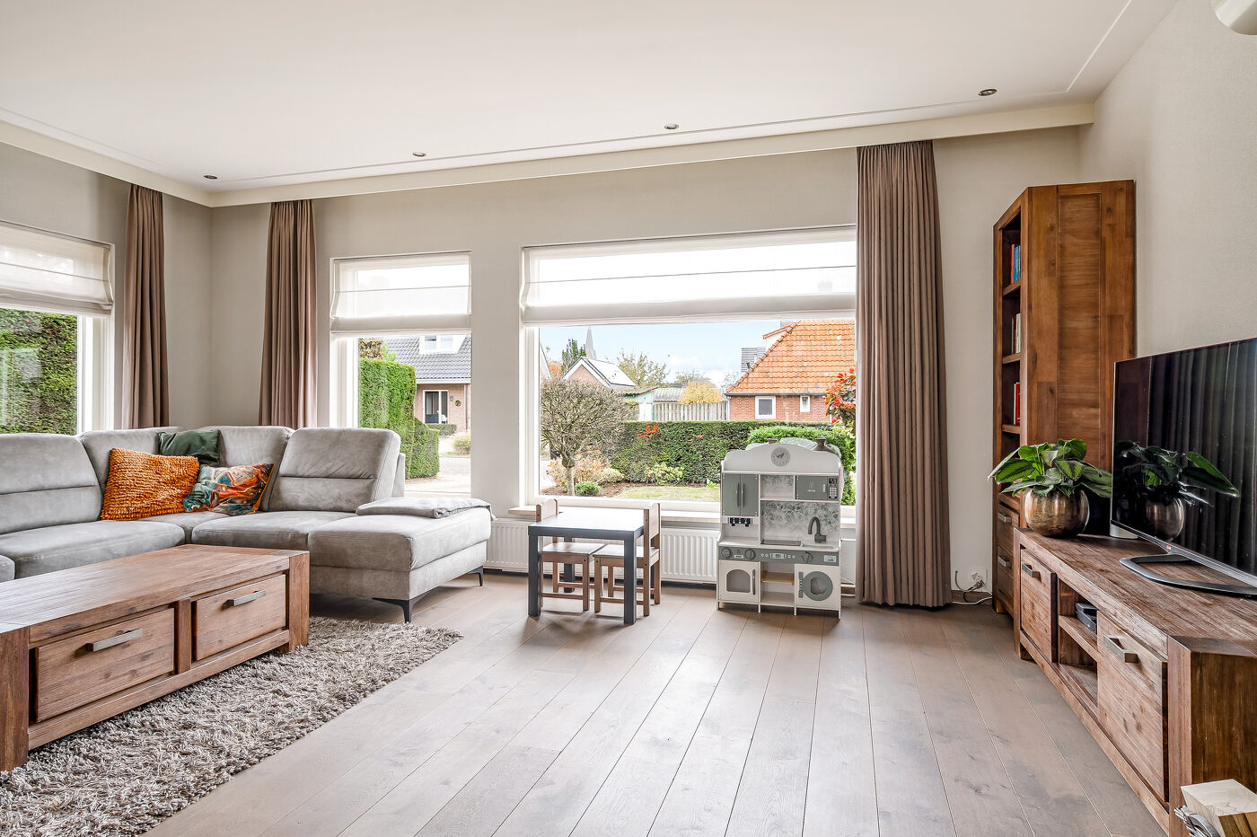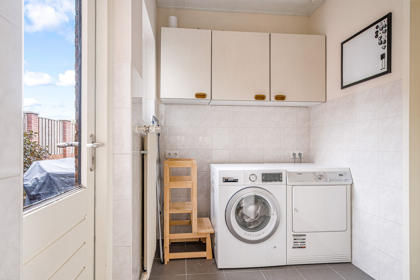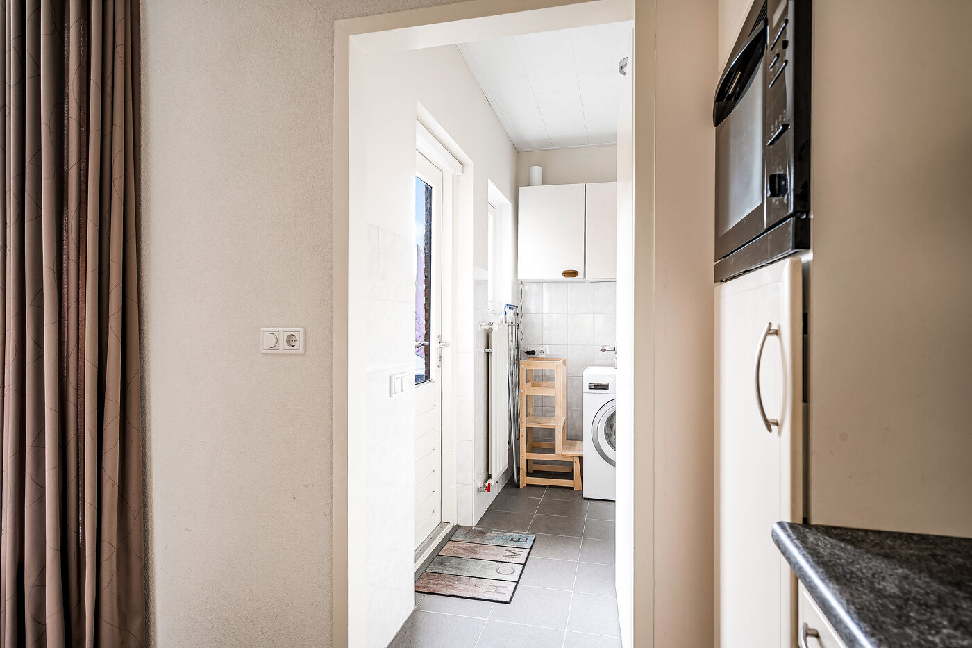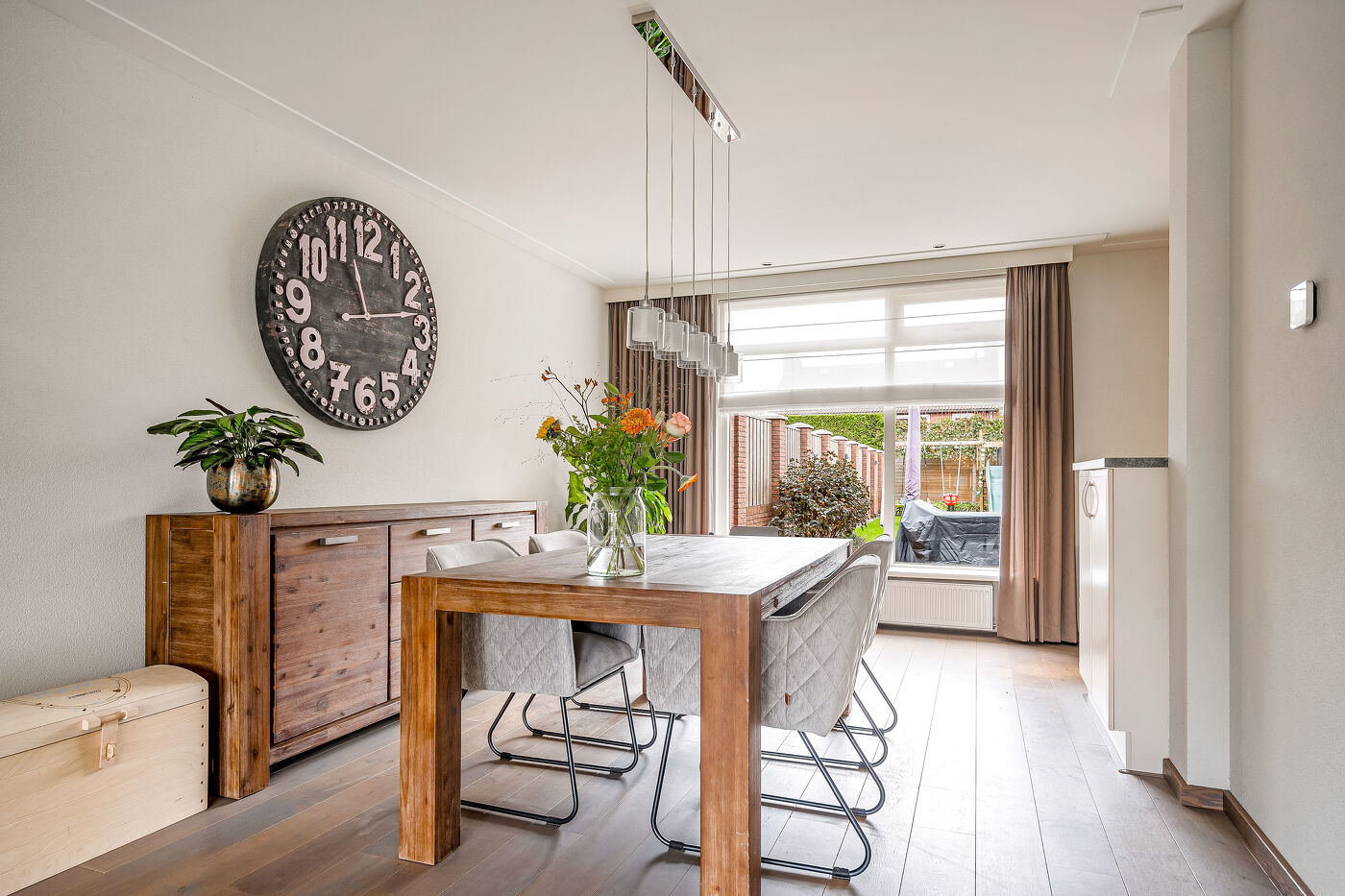 Begane grond: Je komt binnen in de hal met meterkast en een modern toilet. De ruime woonkamer is licht en sfeervol, voorzien van een gezellige speksteenkachel. Aansluitend bevindt zich de eethoek met de open keuken. Deze keuken is in de loop der jaren keurig onderhouden en voorzien van diverse inbouwapparatuur, waaronder een koelkast, keramische kookplaat, combi-oven, vaatwasser en afzuigkap. Vanuit zowel de woonkamer als de keuken heb je uitzicht op de diepe, zonnige achtertuin. Grenzend aan de keuken ligt de praktische bijkeuken met aansluitingen voor wasmachine en droger. Vanuit hier bereik je de achtertuin of loop je direct door naar de inpandige garage, die is voorzien van elektra en verwarming en beschikt over een ruime bergzolder van circa 22 m², ideaal als opslag- of hobbyruimte.