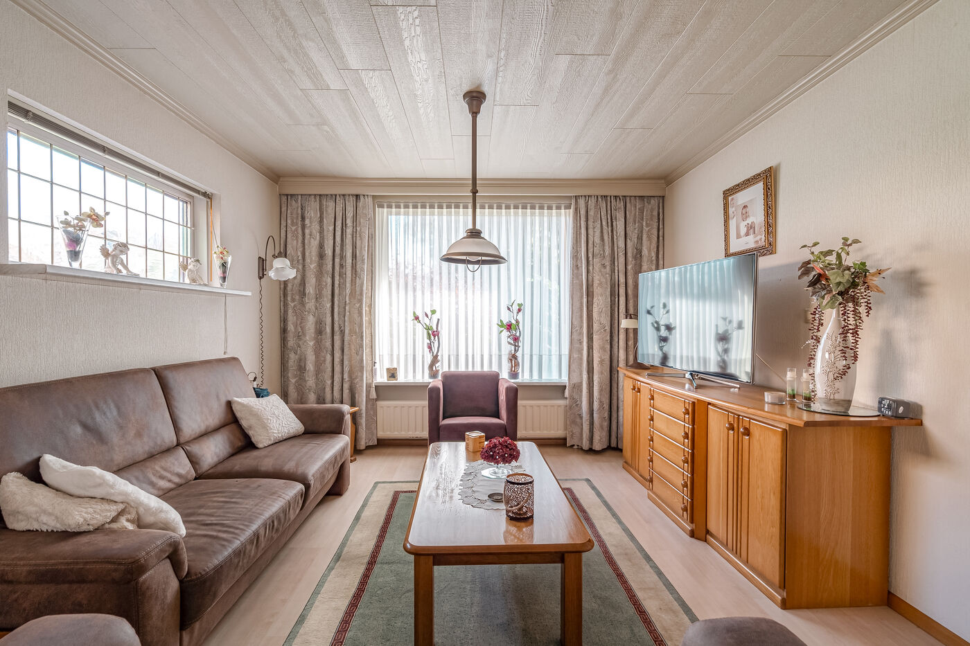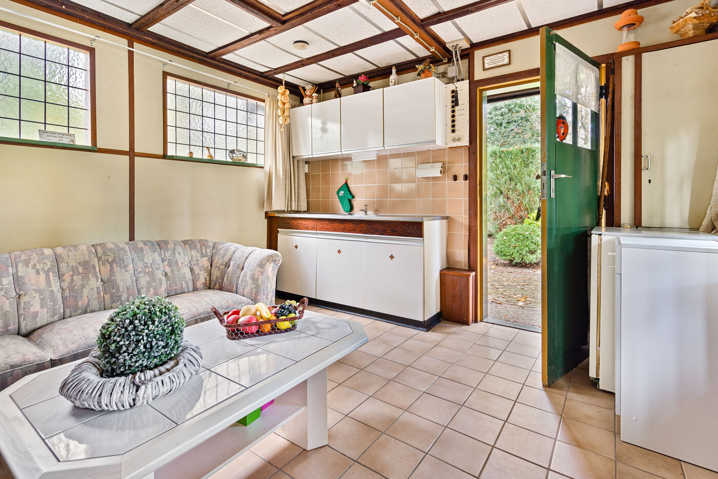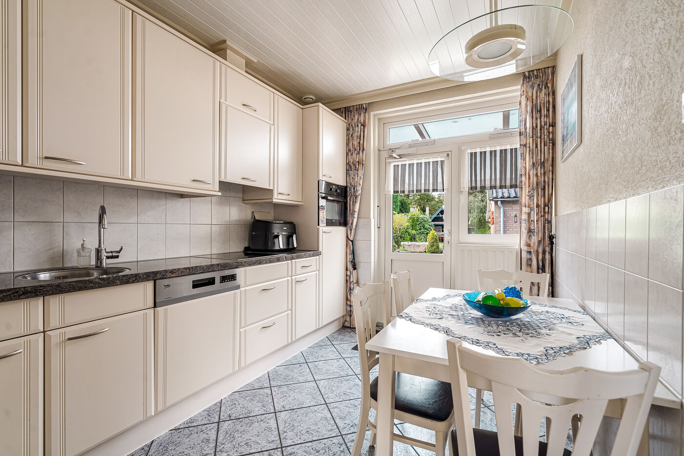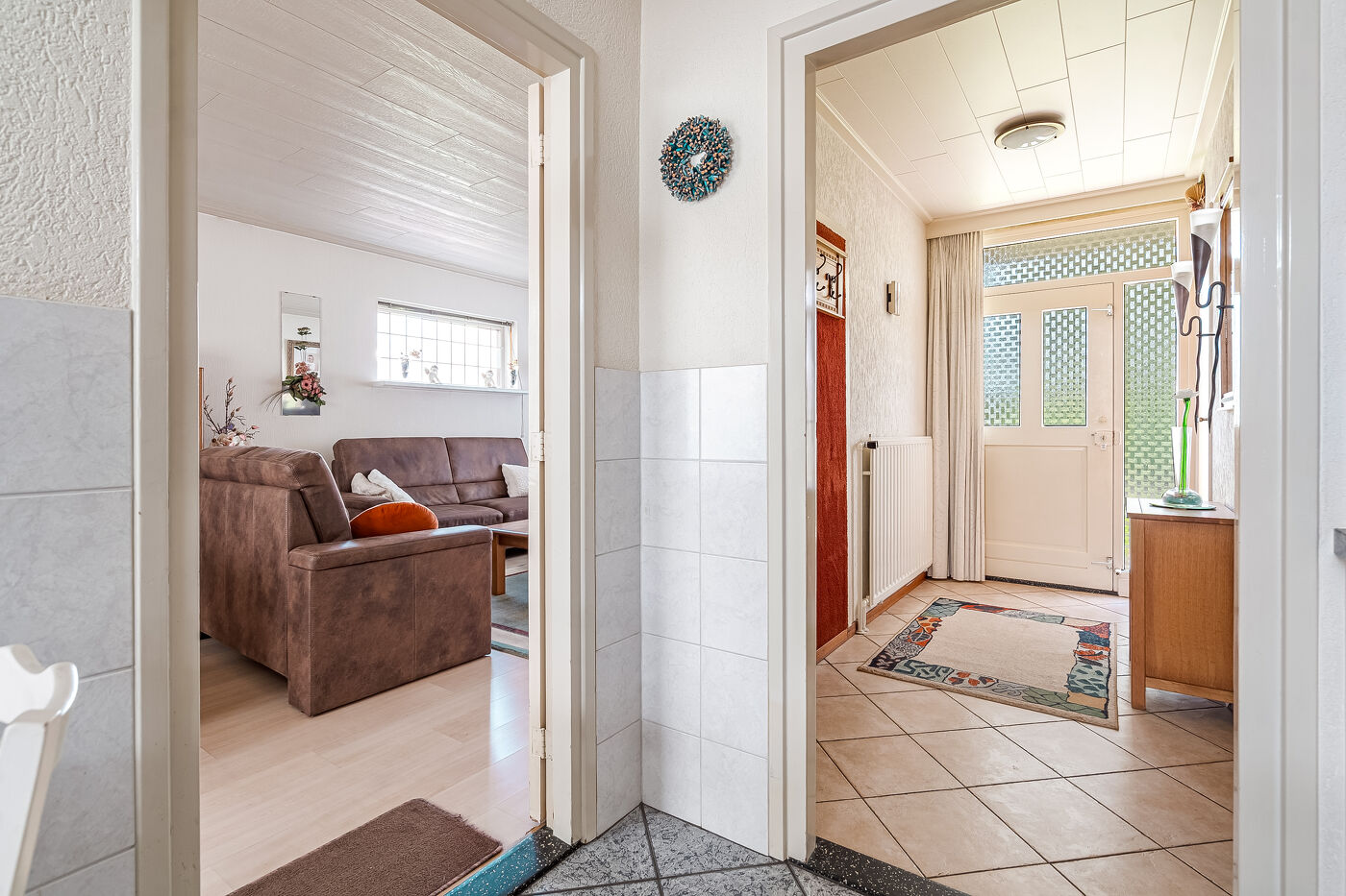 De fraai aangelegde voortuin geeft de woning een warme, uitnodigende uitstraling. Via het looppad naast de oprit bereik je de entree. Vanuit de hal heb je toegang tot de woonkamer, keuken, slaapkamers, badkamer en de trap naar de eerste verdieping. De woonkamer is ruim opgezet en beschikt over grote ramen die zorgen voor een fijne lichtinval en een prettig zicht op de groene voortuin. De sfeer is rustig en tijdloos, met volop mogelijkheden om de ruimte volledig naar eigen smaak te moderniseren. Vanuit de woonkamer heb je directe toegang tot de keuken. Deze bevindt zich centraal in de woning en is praktisch ingedeeld, met voldoende werk- en bergruimte. Aansluitend ligt de deur naar de royale overkapping achter het huis: een heerlijke plek om in elk seizoen te genieten van het uitzicht op de diepe, fraai aangelegde tuin.