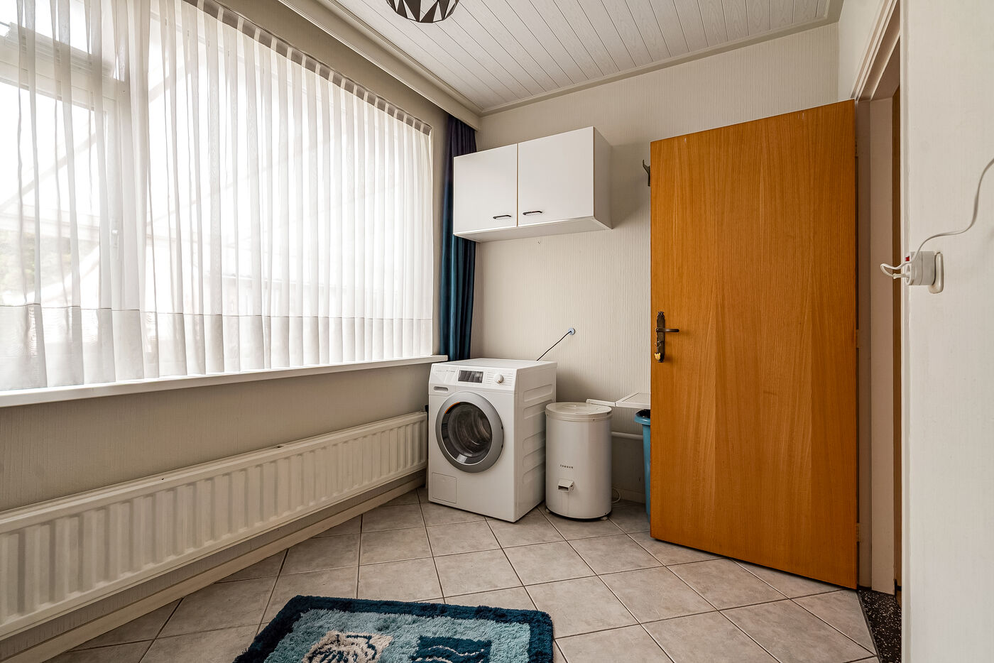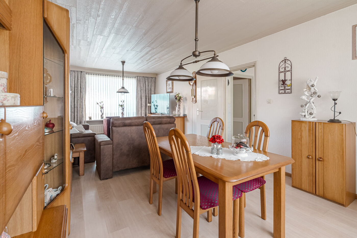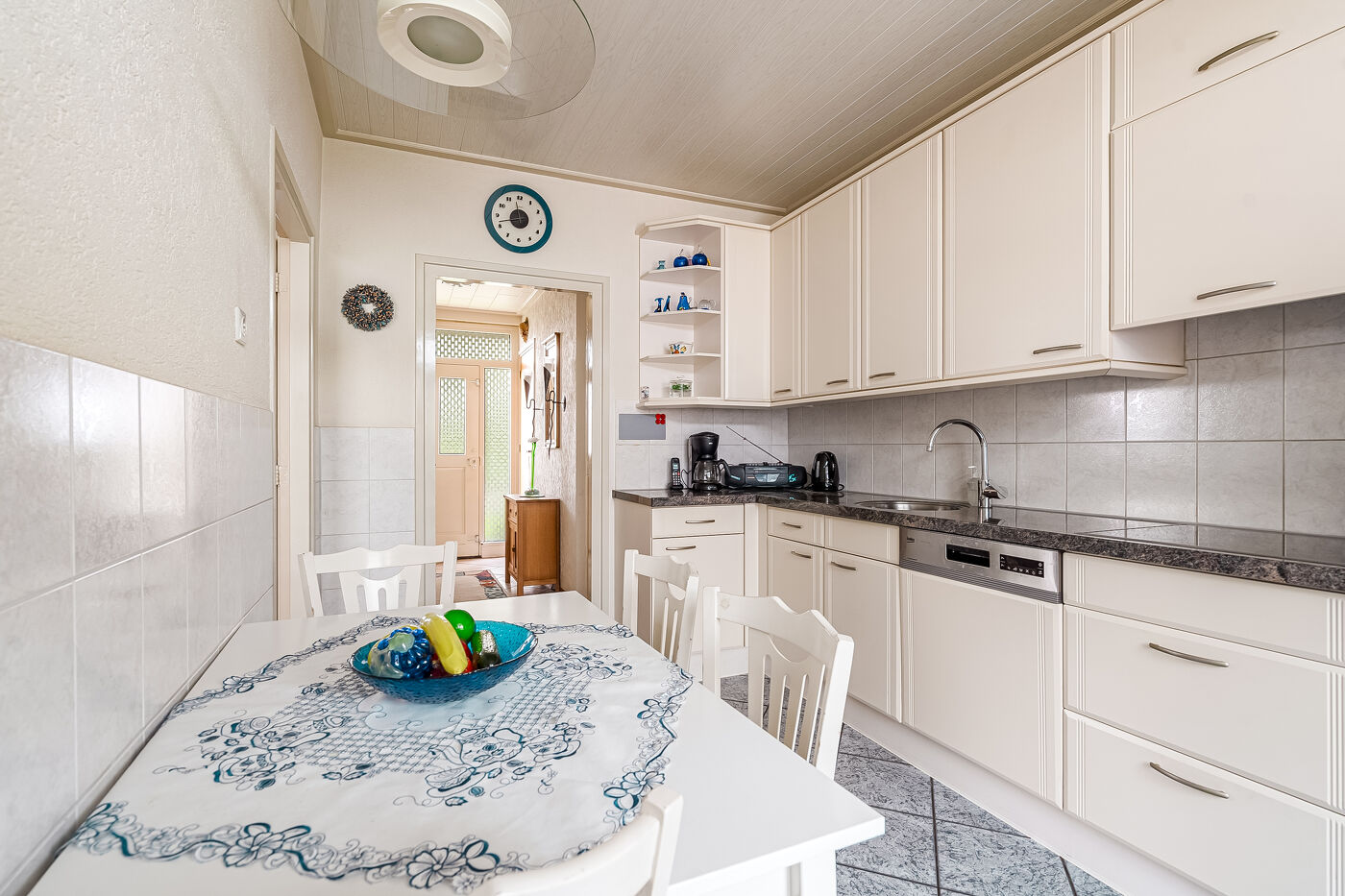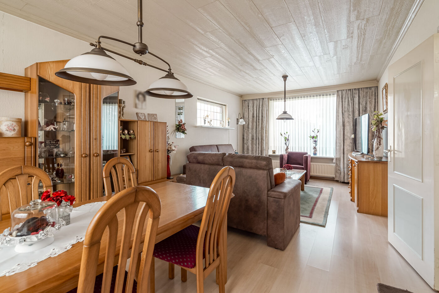 De fraai aangelegde voortuin geeft de woning een warme, uitnodigende uitstraling. Via het looppad naast de oprit bereik je de entree. Vanuit de hal heb je toegang tot de woonkamer, keuken, slaapkamers, badkamer en de trap naar de eerste verdieping. De woonkamer is ruim opgezet en beschikt over grote ramen die zorgen voor een fijne lichtinval en een prettig zicht op de groene voortuin. De sfeer is rustig en tijdloos, met volop mogelijkheden om de ruimte volledig naar eigen smaak te moderniseren. Vanuit de woonkamer heb je directe toegang tot de keuken. Deze bevindt zich centraal in de woning en is praktisch ingedeeld, met voldoende werk- en bergruimte. Aansluitend ligt de deur naar de royale overkapping achter het huis: een heerlijke plek om in elk seizoen te genieten van het uitzicht op de diepe, fraai aangelegde tuin.