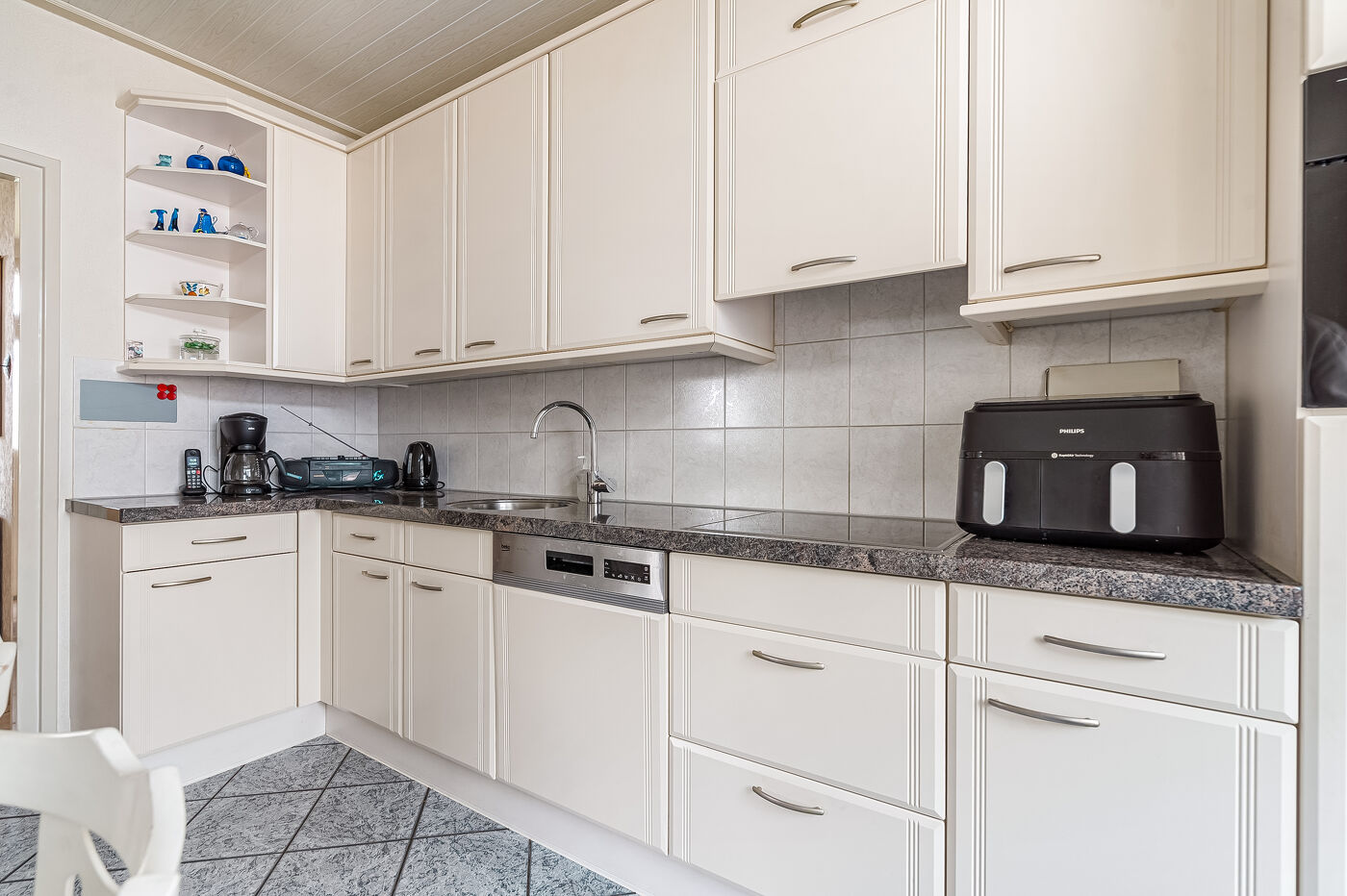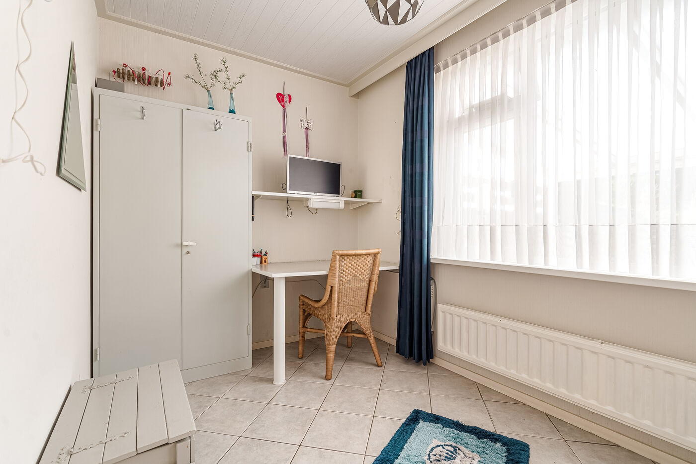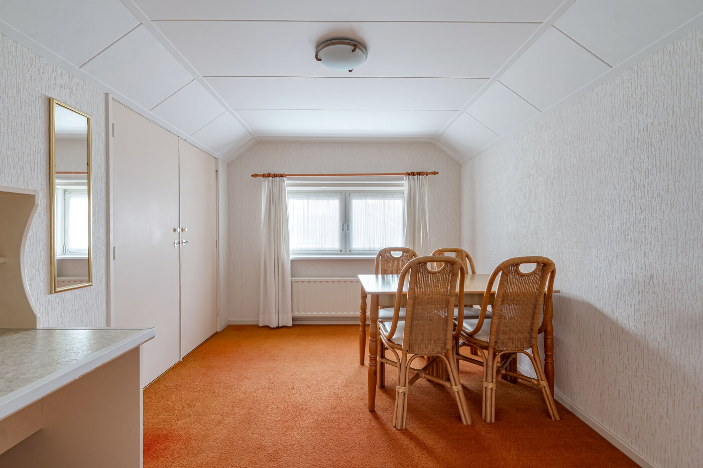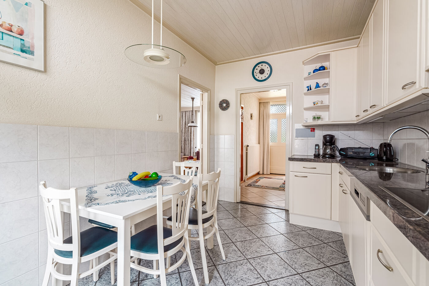De fraai aangelegde voortuin geeft de woning een warme, uitnodigende uitstraling. Via het looppad naast de oprit bereik je de entree. Vanuit de hal heb je toegang tot de woonkamer, keuken, slaapkamers, badkamer en de trap naar de eerste verdieping. De woonkamer is ruim opgezet en beschikt over grote ramen die zorgen voor een fijne lichtinval en een prettig zicht op de groene voortuin. De sfeer is rustig en tijdloos, met volop mogelijkheden om de ruimte volledig naar eigen smaak te moderniseren. Vanuit de woonkamer heb je directe toegang tot de keuken. Deze bevindt zich centraal in de woning en is praktisch ingedeeld, met voldoende werk- en bergruimte. Aansluitend ligt de deur naar de royale overkapping achter het huis: een heerlijke plek om in elk seizoen te genieten van het uitzicht op de diepe, fraai aangelegde tuin.