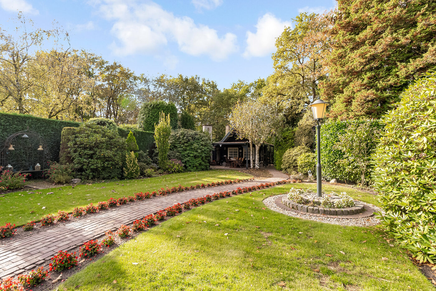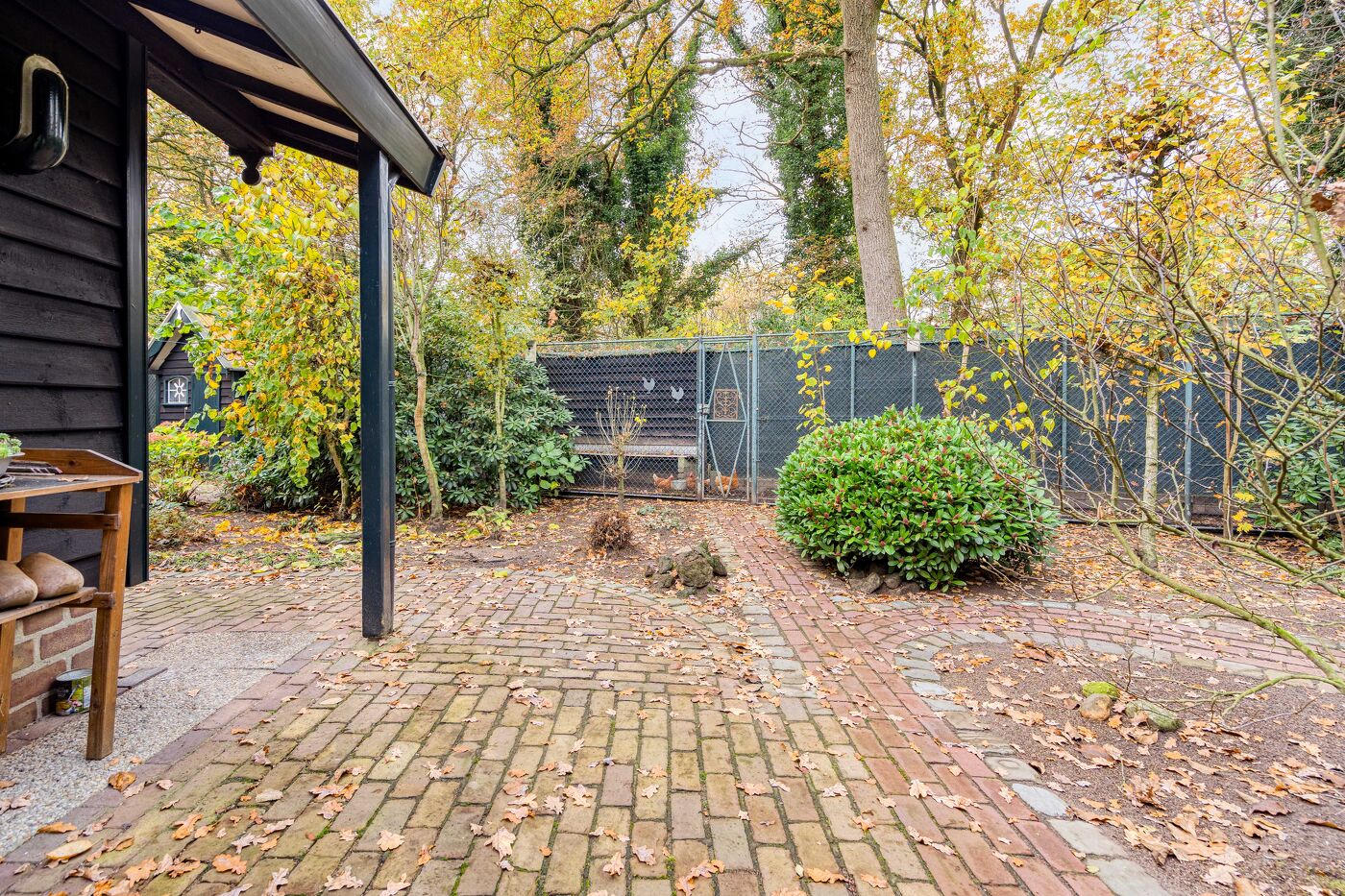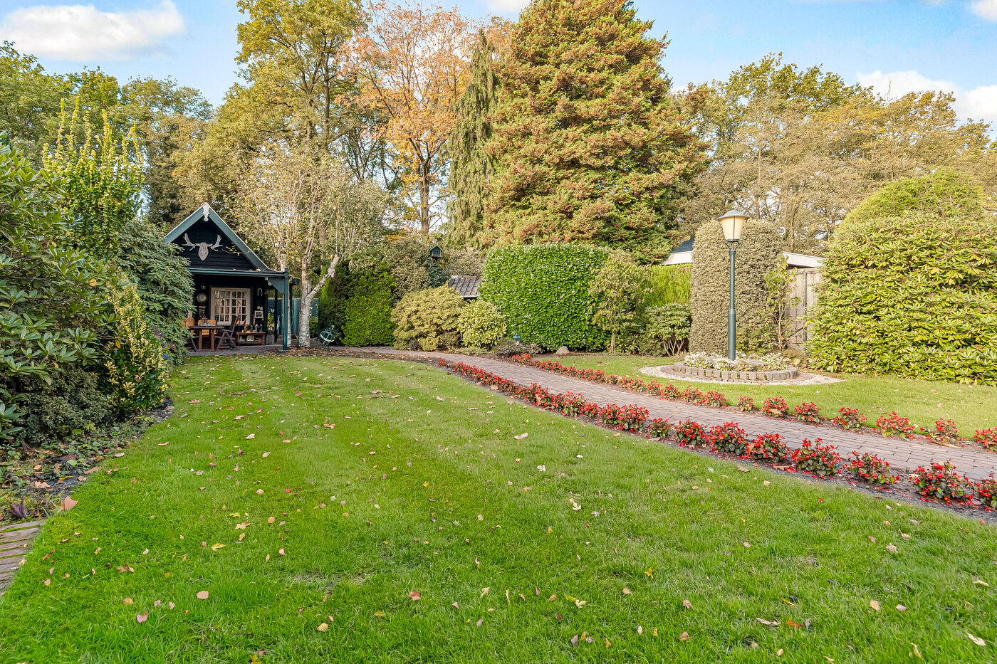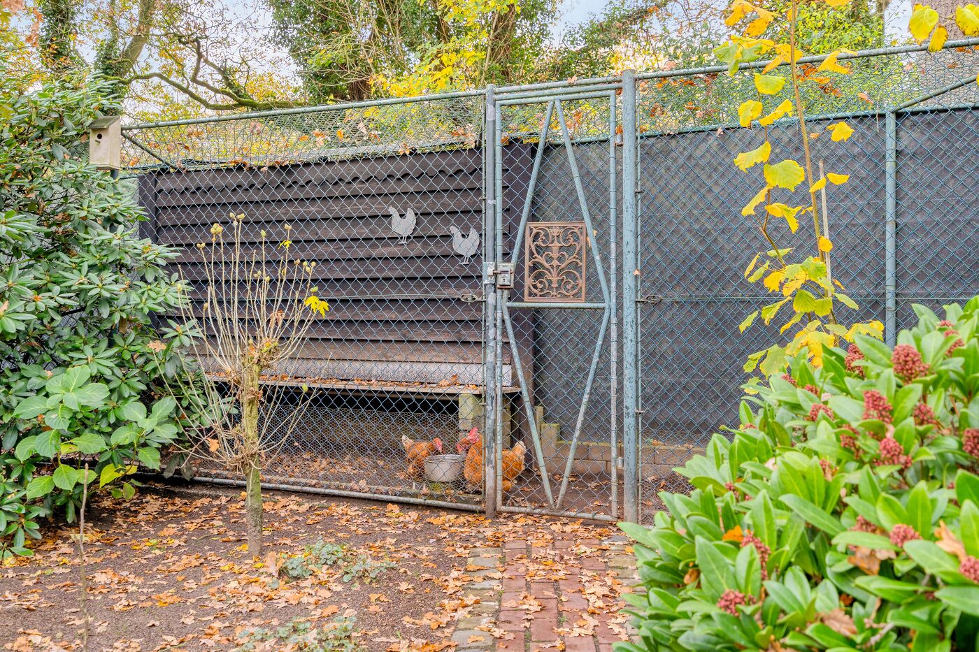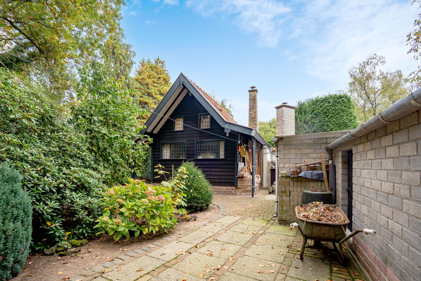 De achtertuin is een waar groen paradijs: diepe borders, volwassen beplanting, ruime gazons en een vrije ligging zorgen voor rust, privacy en een gevoel van ruimte. Helemaal achterin de tuin staat een karakteristiek tuinhuis dat perfect kan dienen als atelier, hobbyruimte of sfeervol buitenverblijf. Het beschikt bovendien over een vliering met extra opbergmogelijkheden, een overkapping en een houtkachel. Aan de achterzijde bevindt zich eveneens een kippenren.