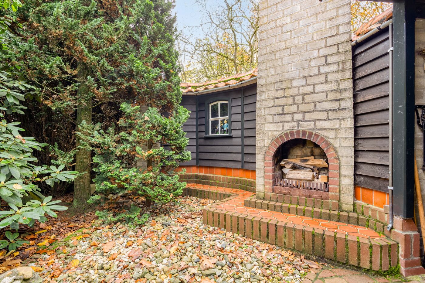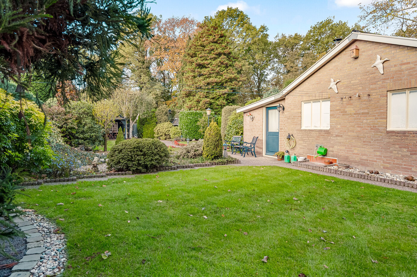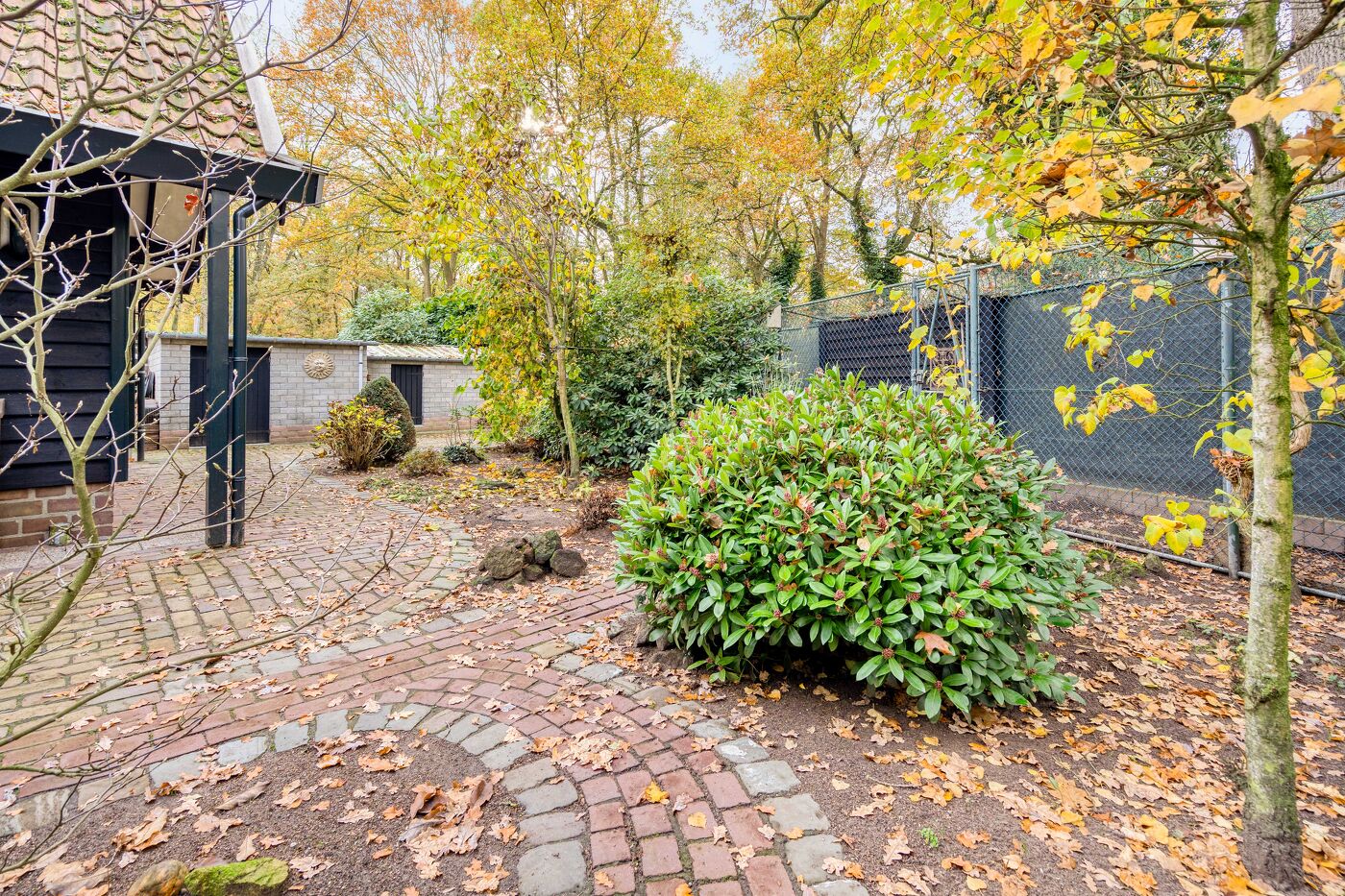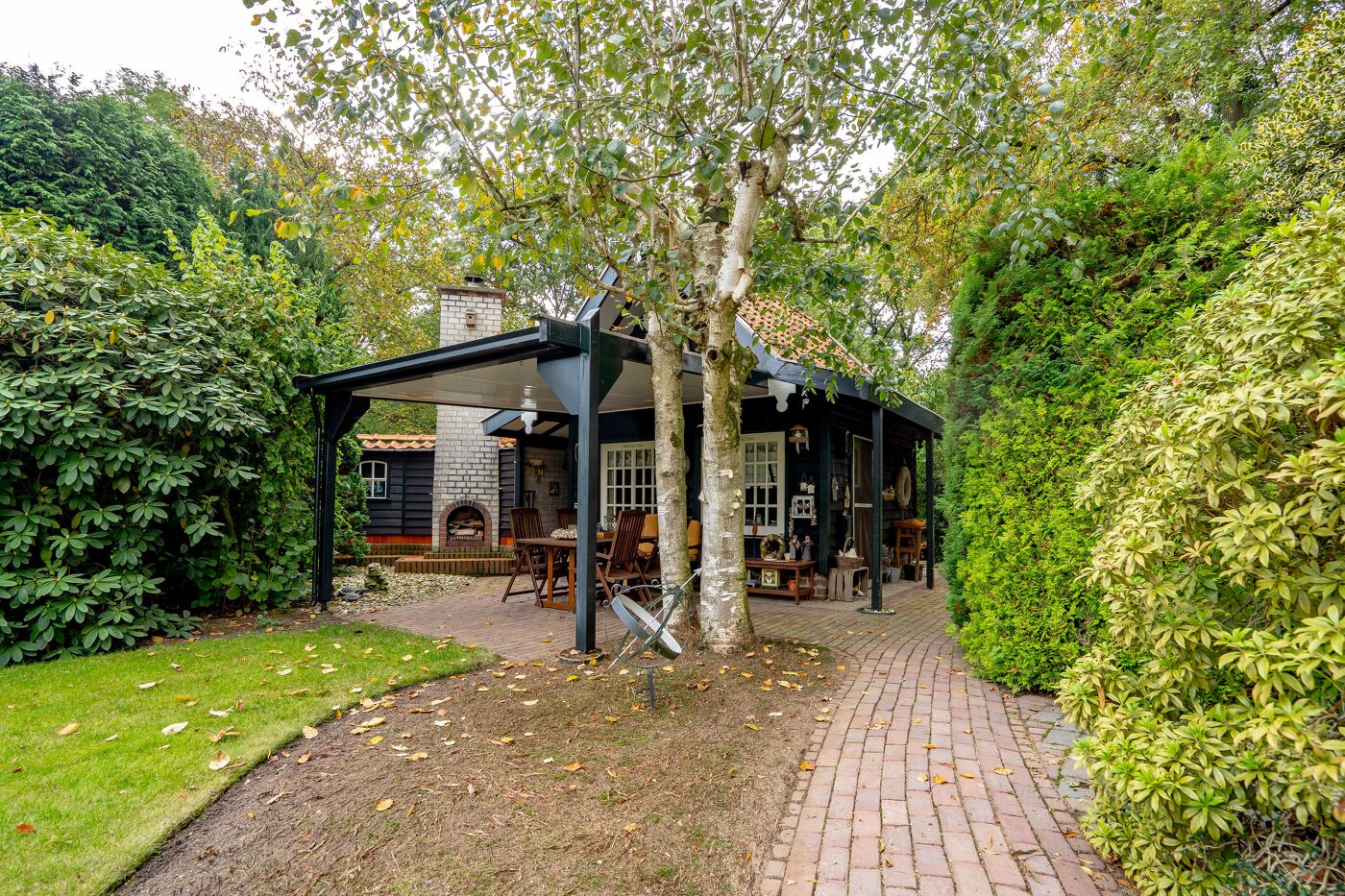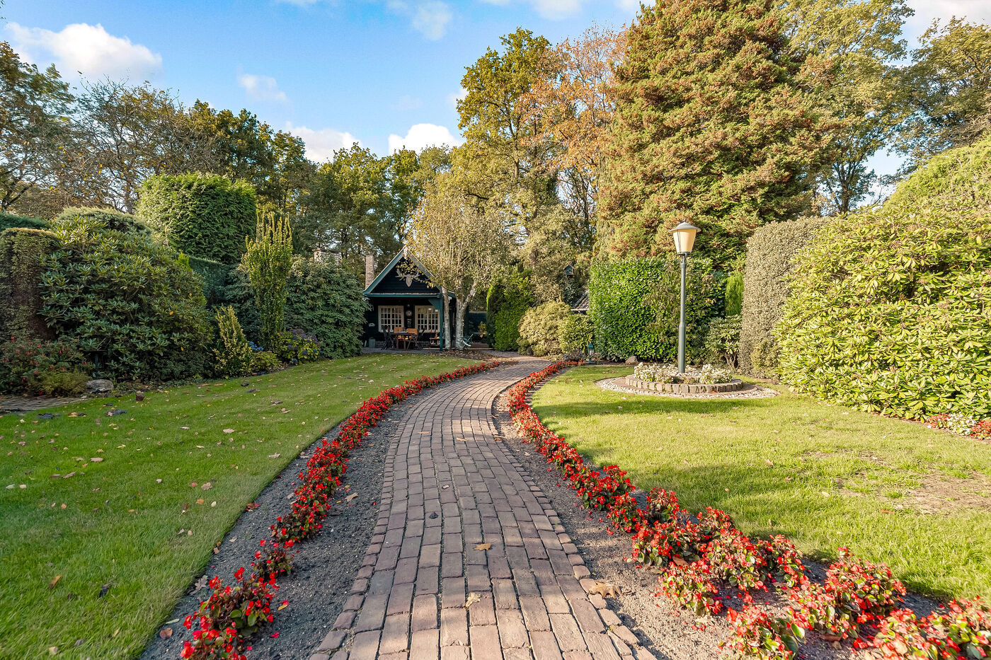 De achtertuin is een waar groen paradijs: diepe borders, volwassen beplanting, ruime gazons en een vrije ligging zorgen voor rust, privacy en een gevoel van ruimte. Helemaal achterin de tuin staat een karakteristiek tuinhuis dat perfect kan dienen als atelier, hobbyruimte of sfeervol buitenverblijf. Het beschikt bovendien over een vliering met extra opbergmogelijkheden, een overkapping en een houtkachel. Aan de achterzijde bevindt zich eveneens een kippenren.