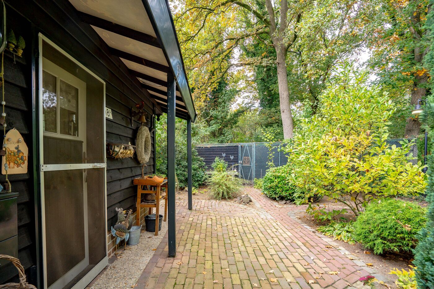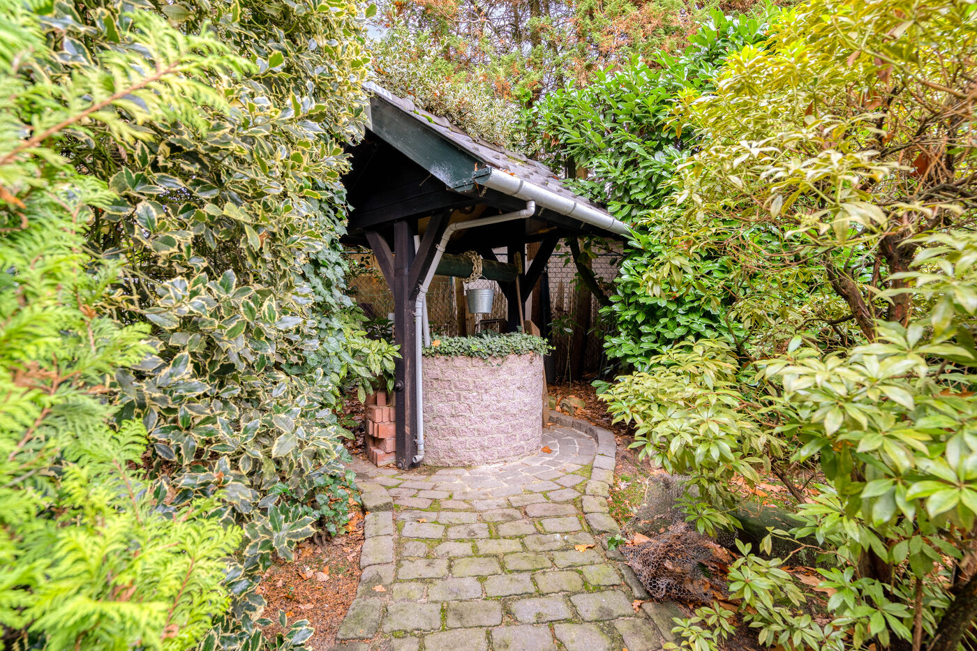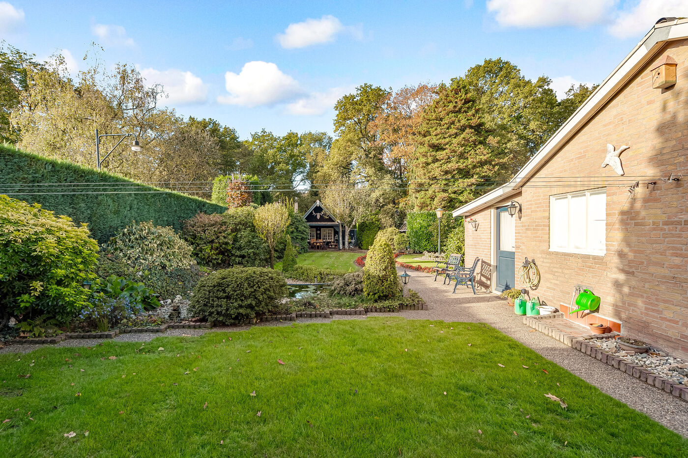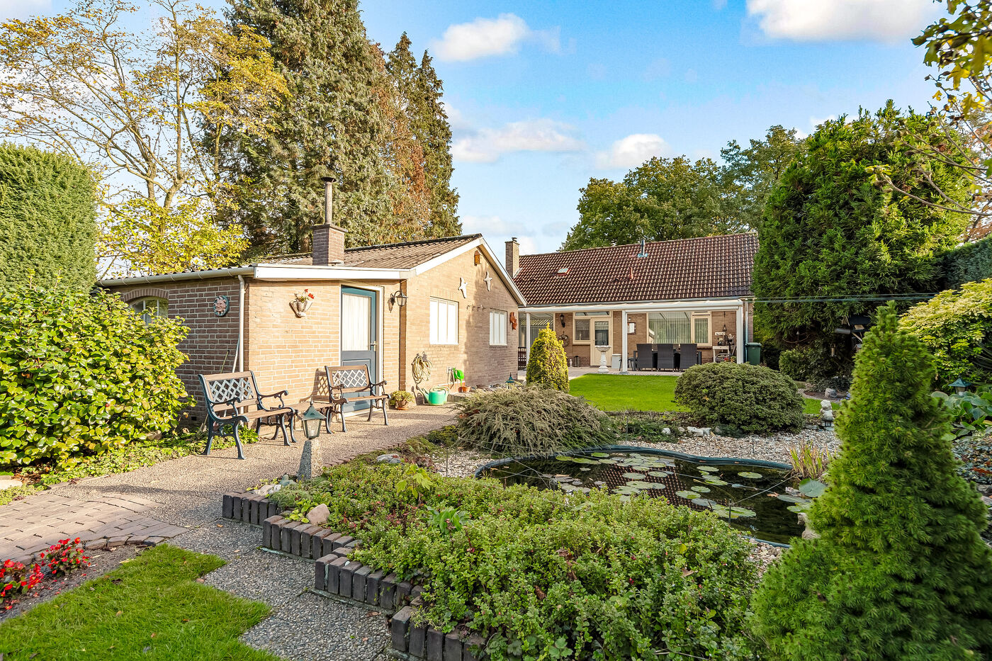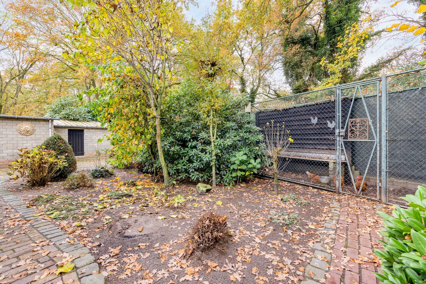 De achtertuin is een waar groen paradijs: diepe borders, volwassen beplanting, ruime gazons en een vrije ligging zorgen voor rust, privacy en een gevoel van ruimte. Helemaal achterin de tuin staat een karakteristiek tuinhuis dat perfect kan dienen als atelier, hobbyruimte of sfeervol buitenverblijf. Het beschikt bovendien over een vliering met extra opbergmogelijkheden, een overkapping en een houtkachel. Aan de achterzijde bevindt zich eveneens een kippenren.