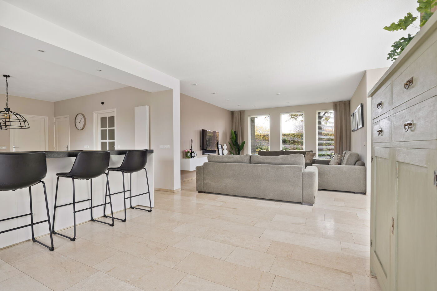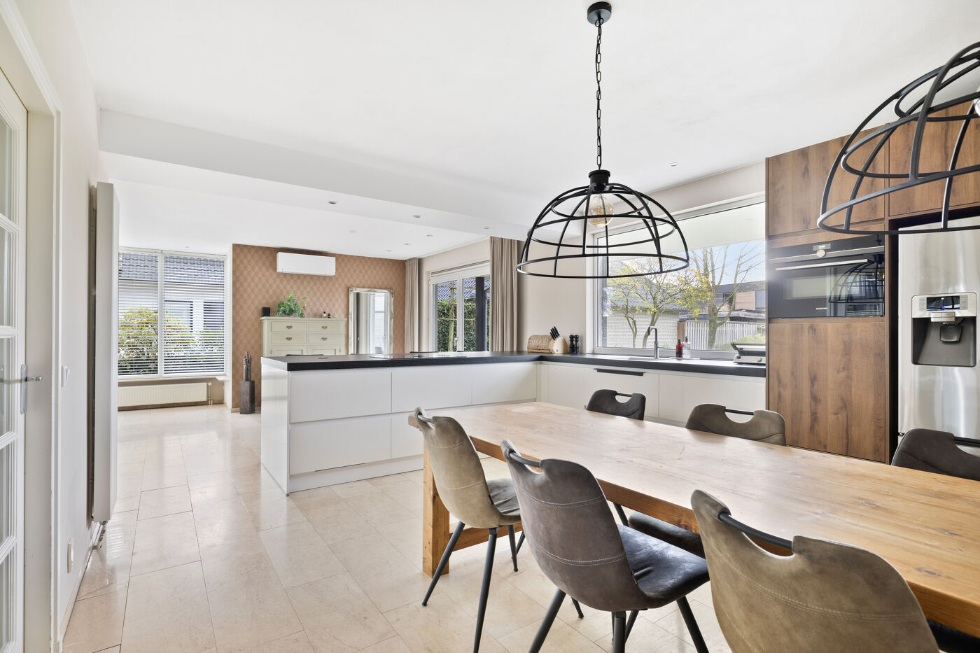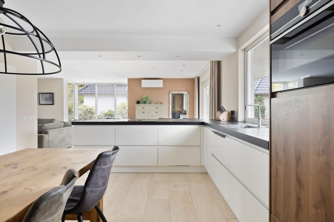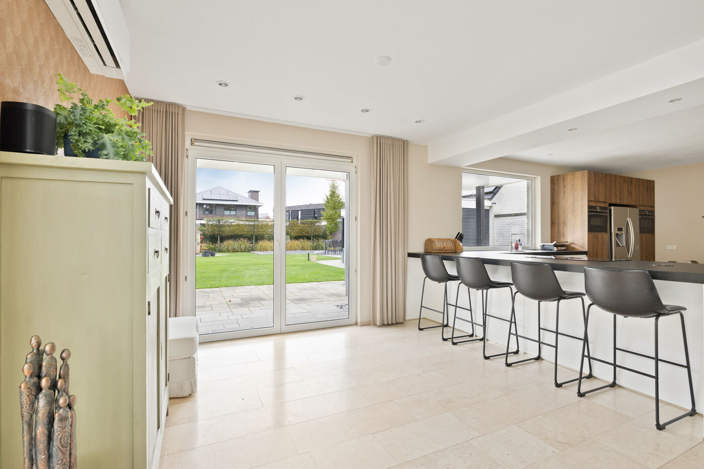 Via de verzorgde voortuin en ruime oprit bereik je de entree van de woning. De hal is ruim en licht, , voorzien van trapopgang en de meterkast. Vanuit hier stap je direct de royale woonkeuken binnen. De moderne keuken vormt het hart van het huis. Deze is uitgevoerd in een luxe opstelling met een royaal werkblad en voorzien van hoogwaardige inbouwapparatuur zoals een inductiekookplaat, combi-oven/magnetron, vaatwasser en Quooker. De keuken staat in open verbinding met de woonkamer, waardoor koken en samenzijn hier naadloos in elkaar overlopen. Dankzij de grote raampartijen, de fraaie erker en de openslaande tuindeuren geniet je hier van veel daglicht en een prachtig zicht op de tuin. De tegelvloer met vloerverwarming en de strakke afwerking zorgen voor een aangename en moderne uitstraling. In de woonkamer is bovendien airconditioning aanwezig, wat het wooncomfort het hele jaar door vergroot.