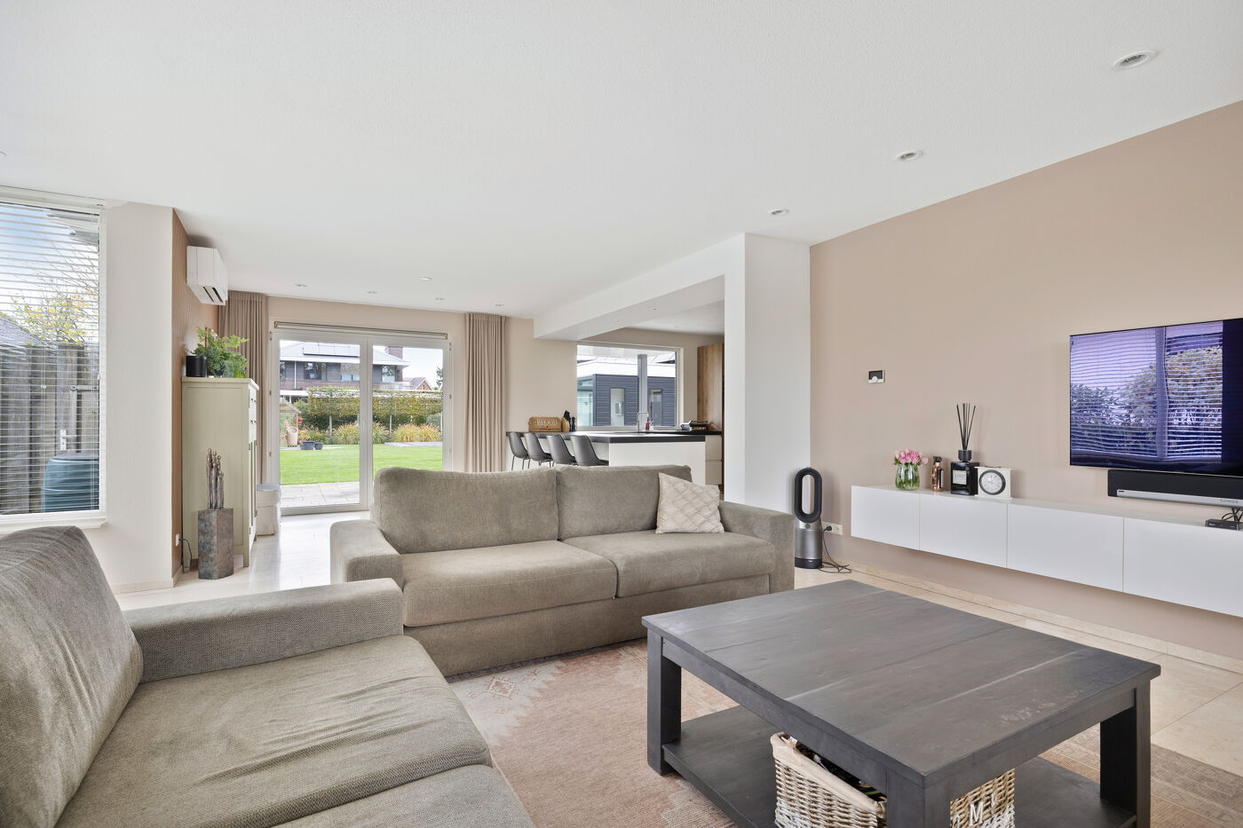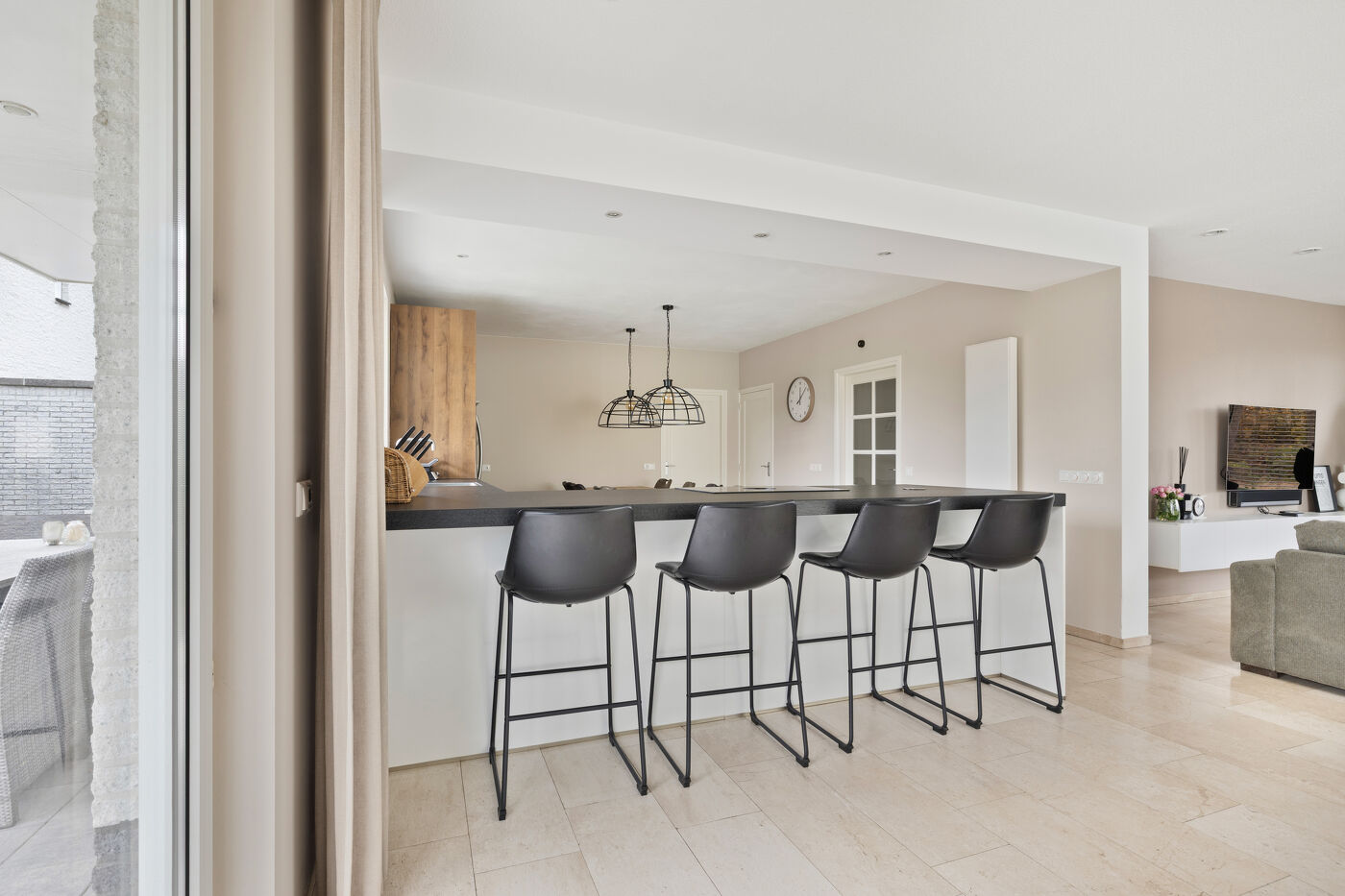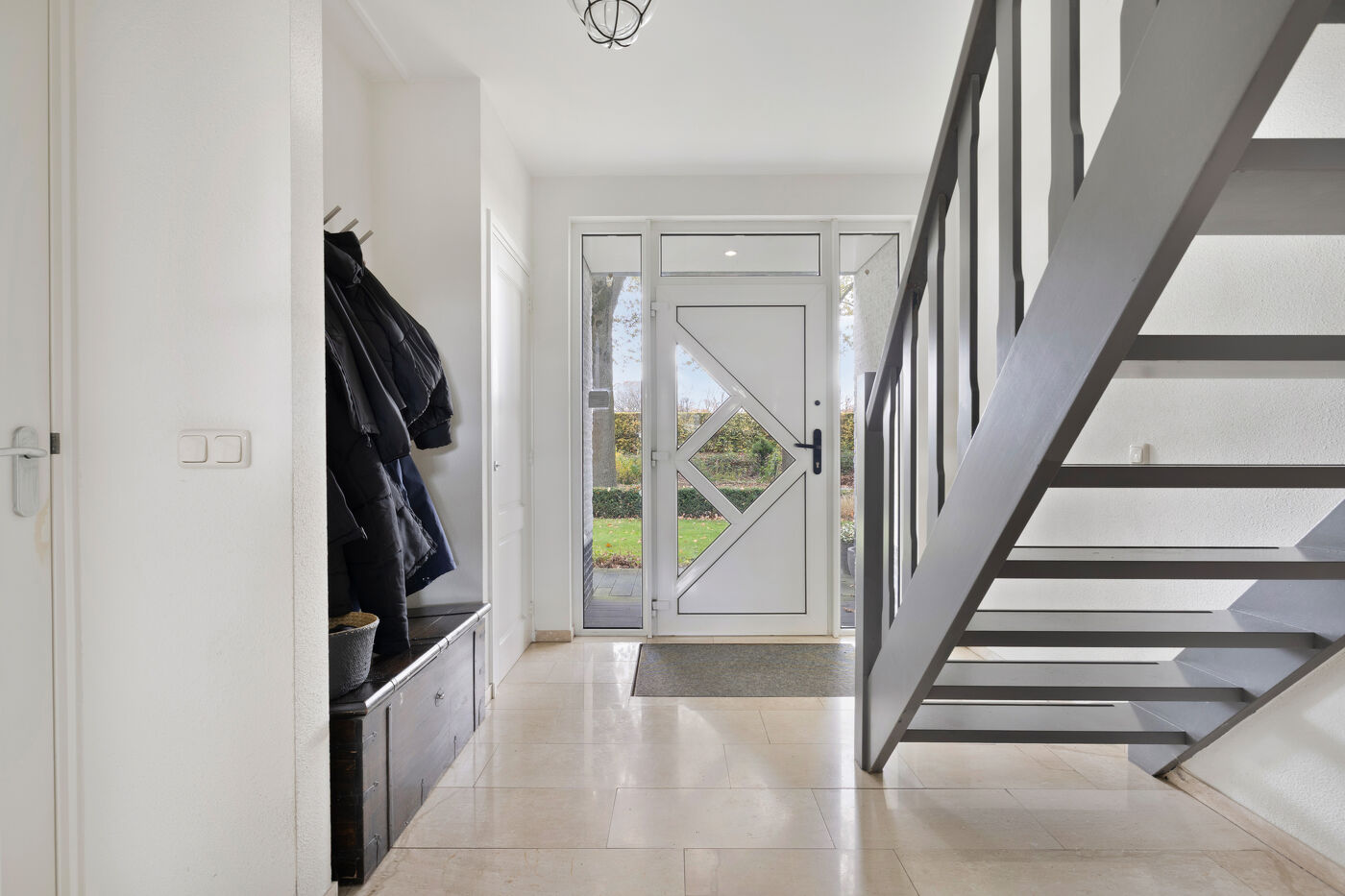 Via de verzorgde voortuin en ruime oprit bereik je de entree van de woning. De hal is ruim en licht, , voorzien van trapopgang en de meterkast. Vanuit hier stap je direct de royale woonkeuken binnen. De moderne keuken vormt het hart van het huis. Deze is uitgevoerd in een luxe opstelling met een royaal werkblad en voorzien van hoogwaardige inbouwapparatuur zoals een inductiekookplaat, combi-oven/magnetron, vaatwasser en Quooker. De keuken staat in open verbinding met de woonkamer, waardoor koken en samenzijn hier naadloos in elkaar overlopen. Dankzij de grote raampartijen, de fraaie erker en de openslaande tuindeuren geniet je hier van veel daglicht en een prachtig zicht op de tuin. De tegelvloer met vloerverwarming en de strakke afwerking zorgen voor een aangename en moderne uitstraling. In de woonkamer is bovendien airconditioning aanwezig, wat het wooncomfort het hele jaar door vergroot.