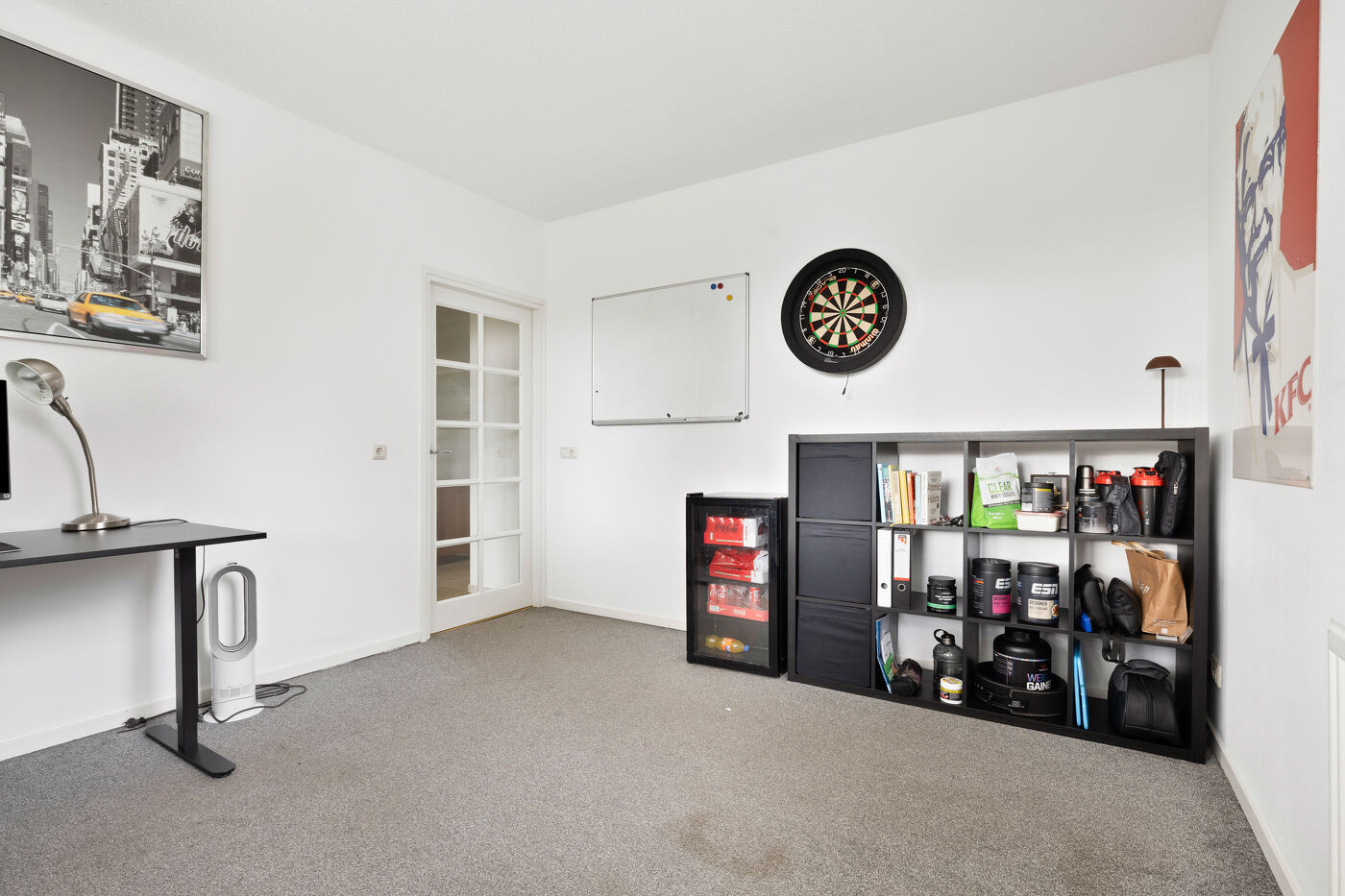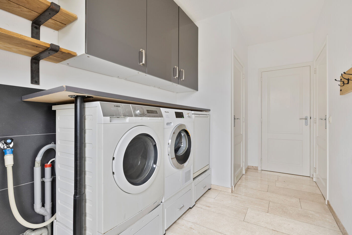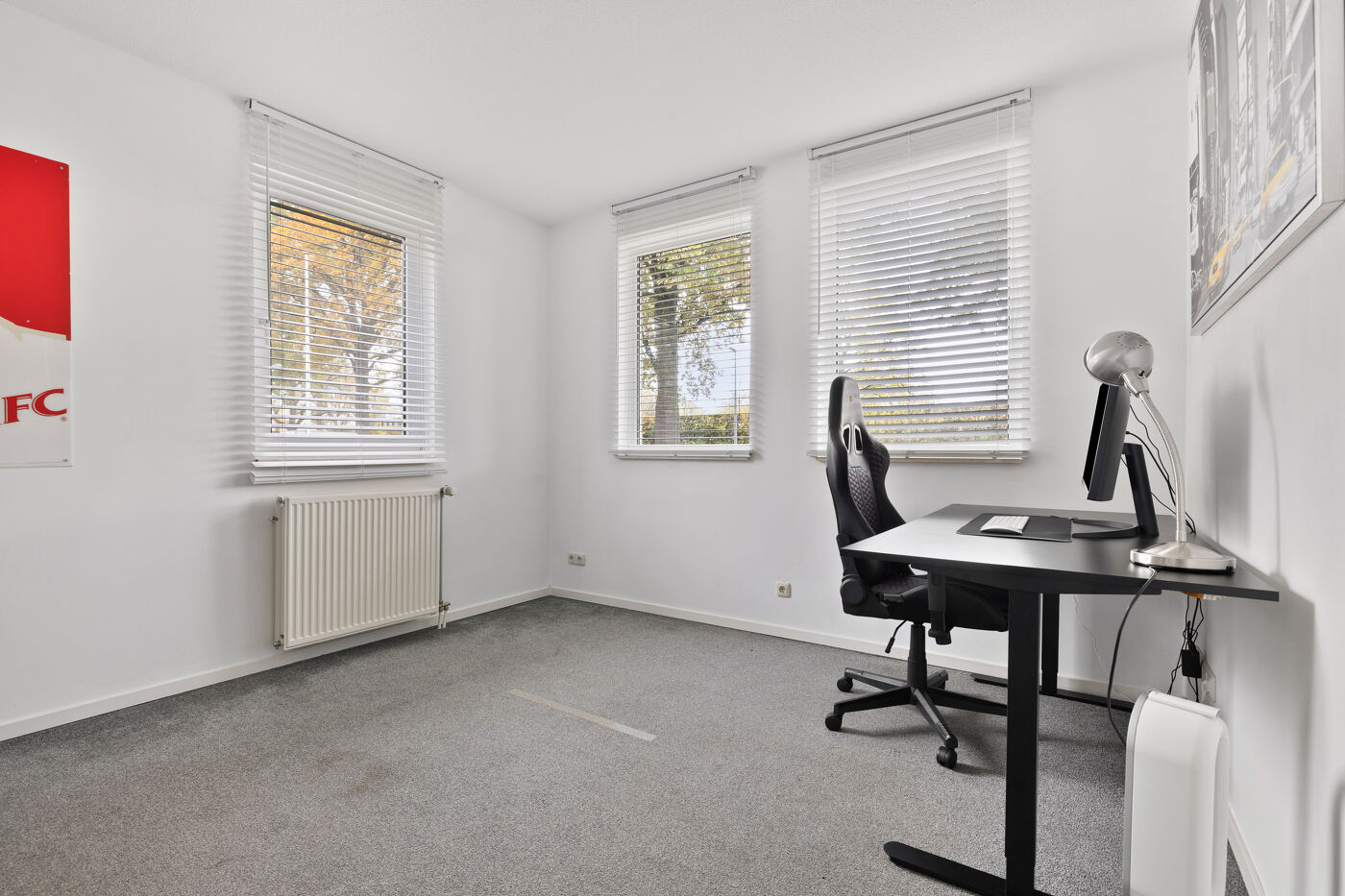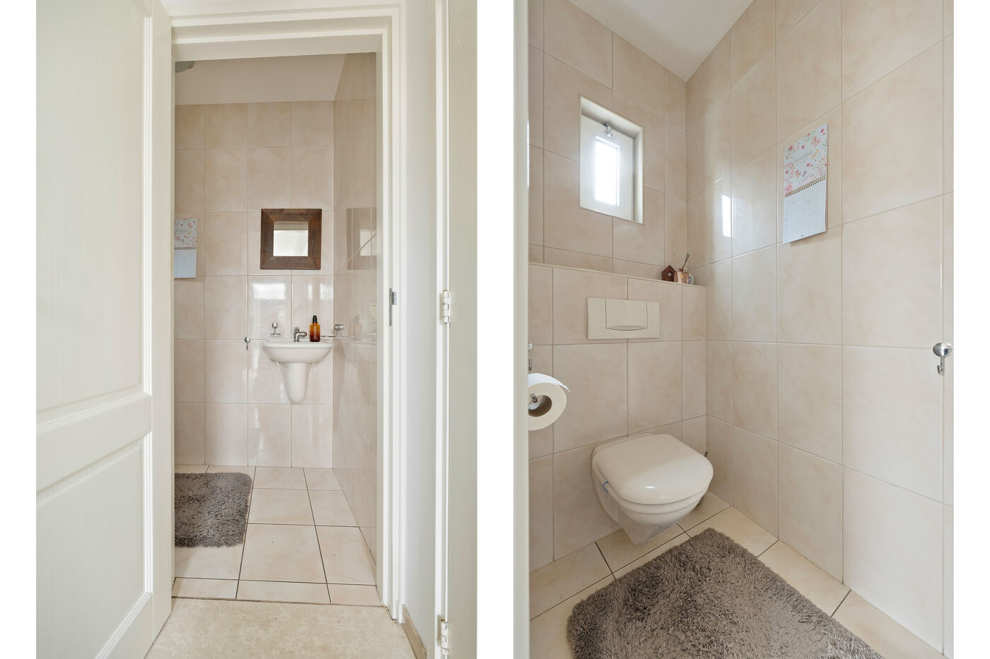 Vanuit de keuken heb je toegang tot de bijkeuken voorzien van een ruim toilet, waar extra werk- en bergruimte beschikbaar is en eveneens de aansluitingen van het witgoed bevinden. Vanuit de hal heb je toegang tot een ruime kantoorruimte aan de voorzijde van het huis.