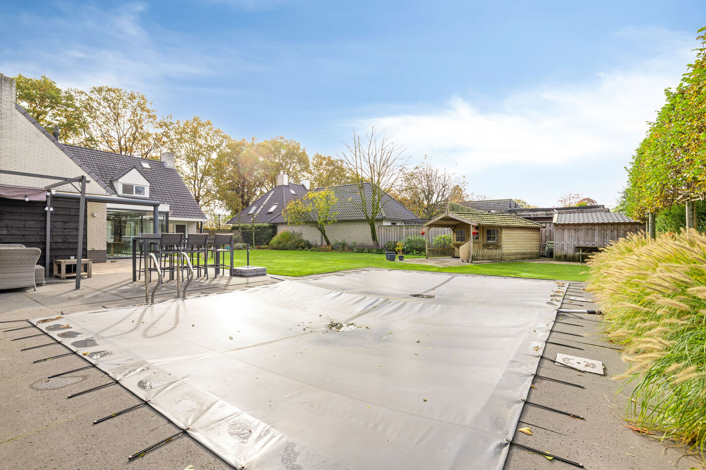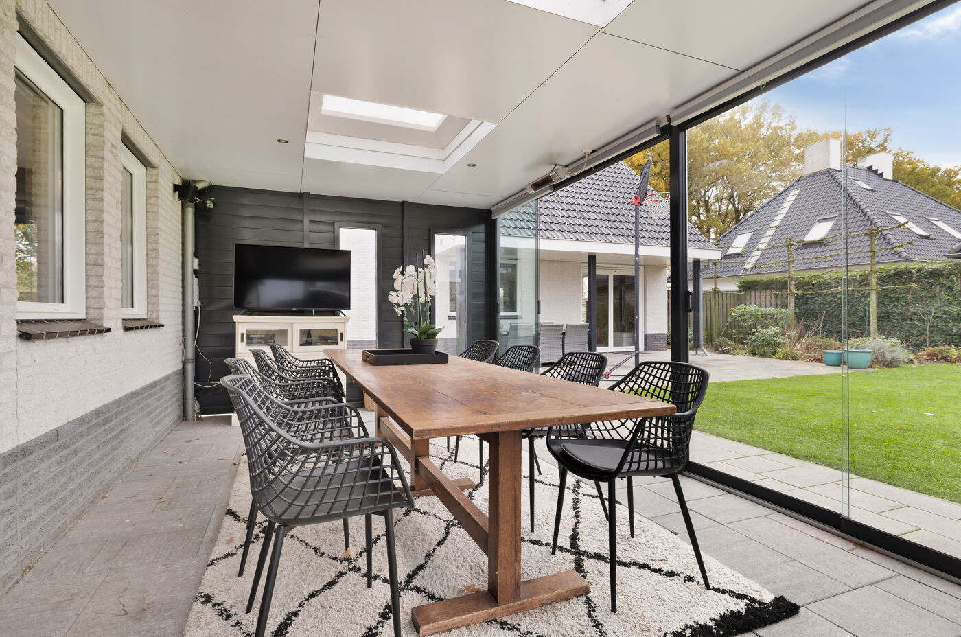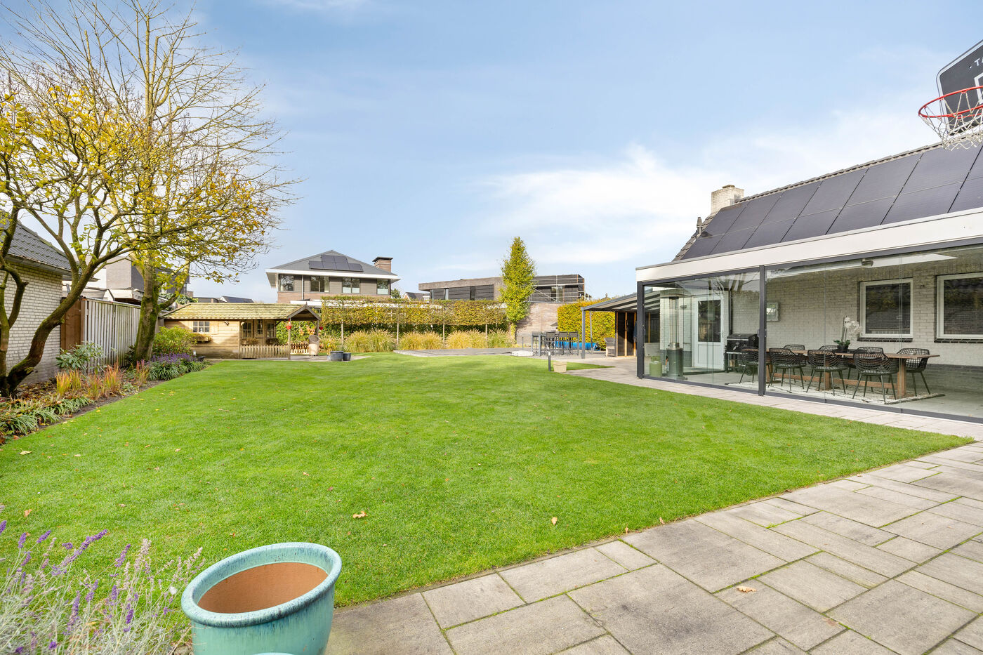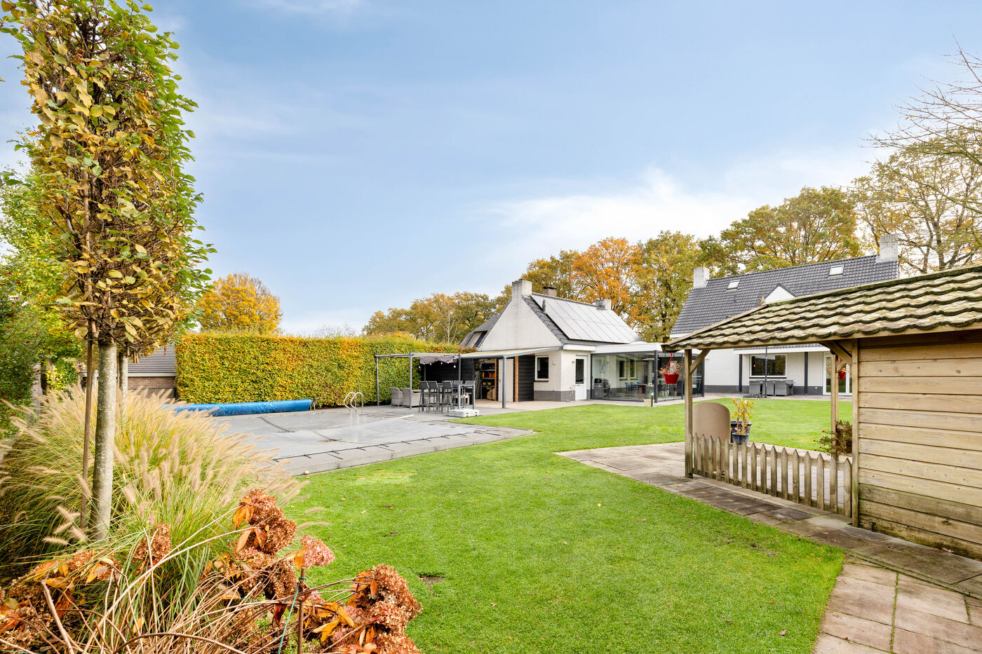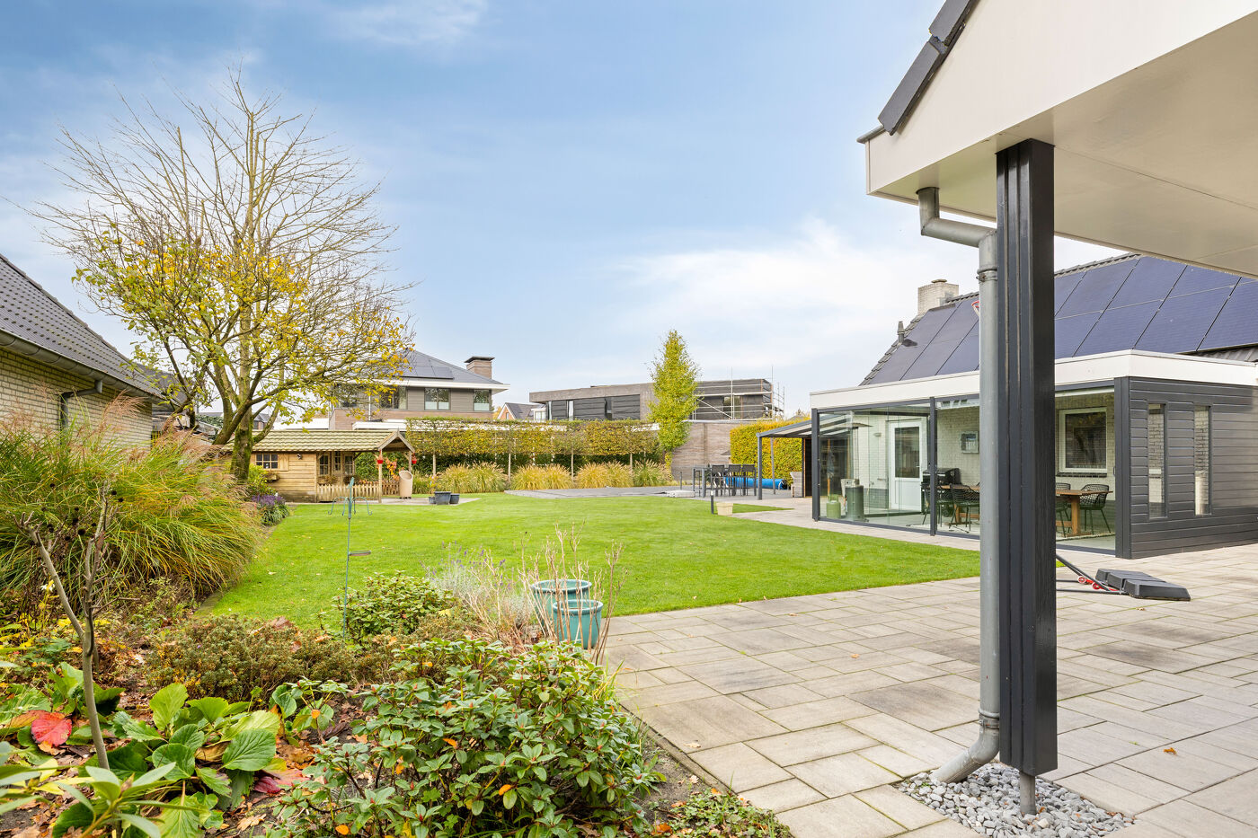 De tuin is netjes aangelegd en biedt veel rust en privacy. Het grote gazon wordt omringd door groene borders en een verzorgde erfafscheiding. Er is een ruime tuinkamer met glazen schuifwanden en lichtkoepels, waardoor je ook bij minder weer comfortabel buiten kunt zitten. Daarnaast zijn er nette terrassen met bestrating, een tuinhuis voor extra bergruimte en een mooi zwembad waar je in de zomer heerlijk kunt ontspannen.
