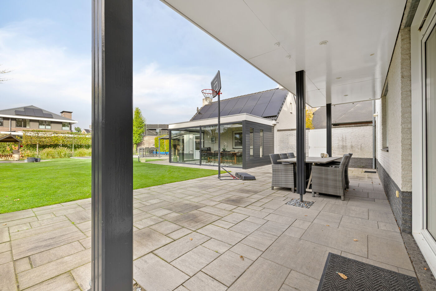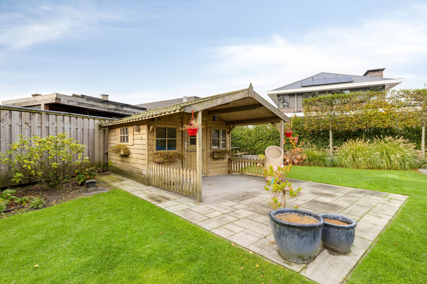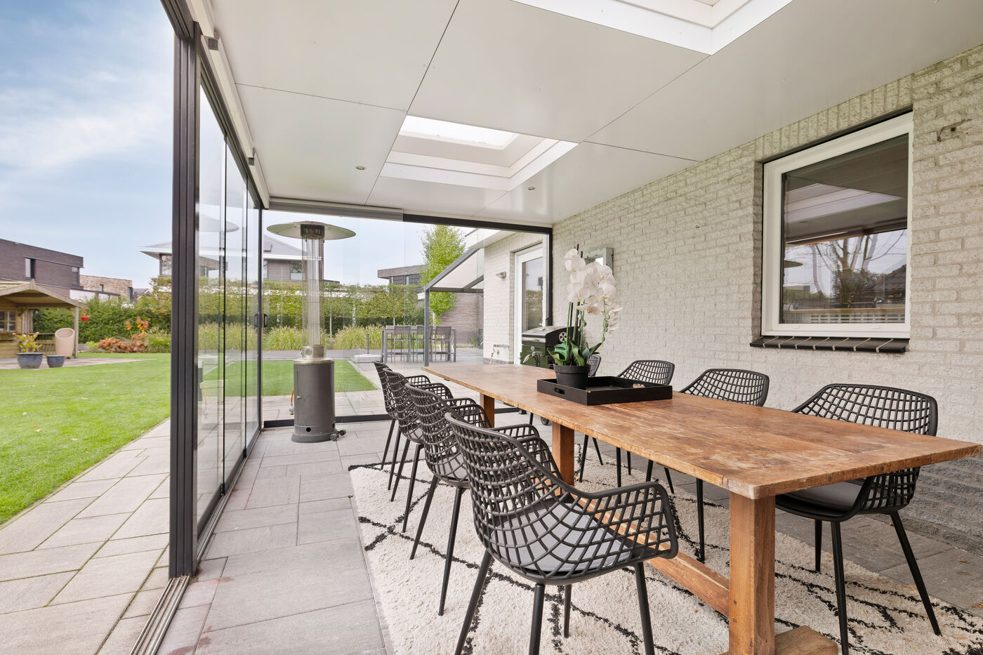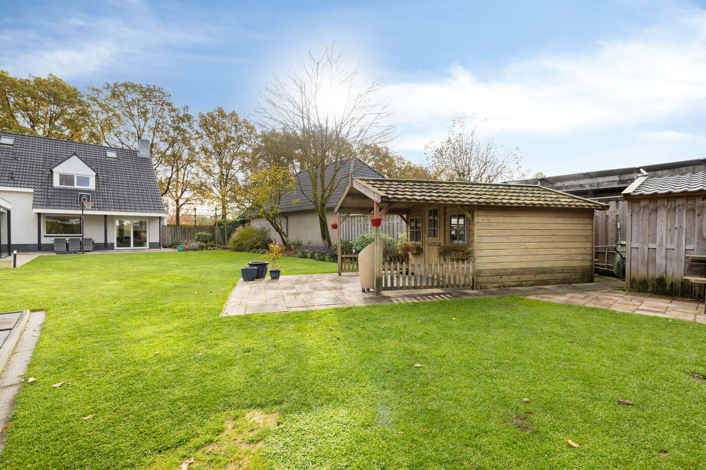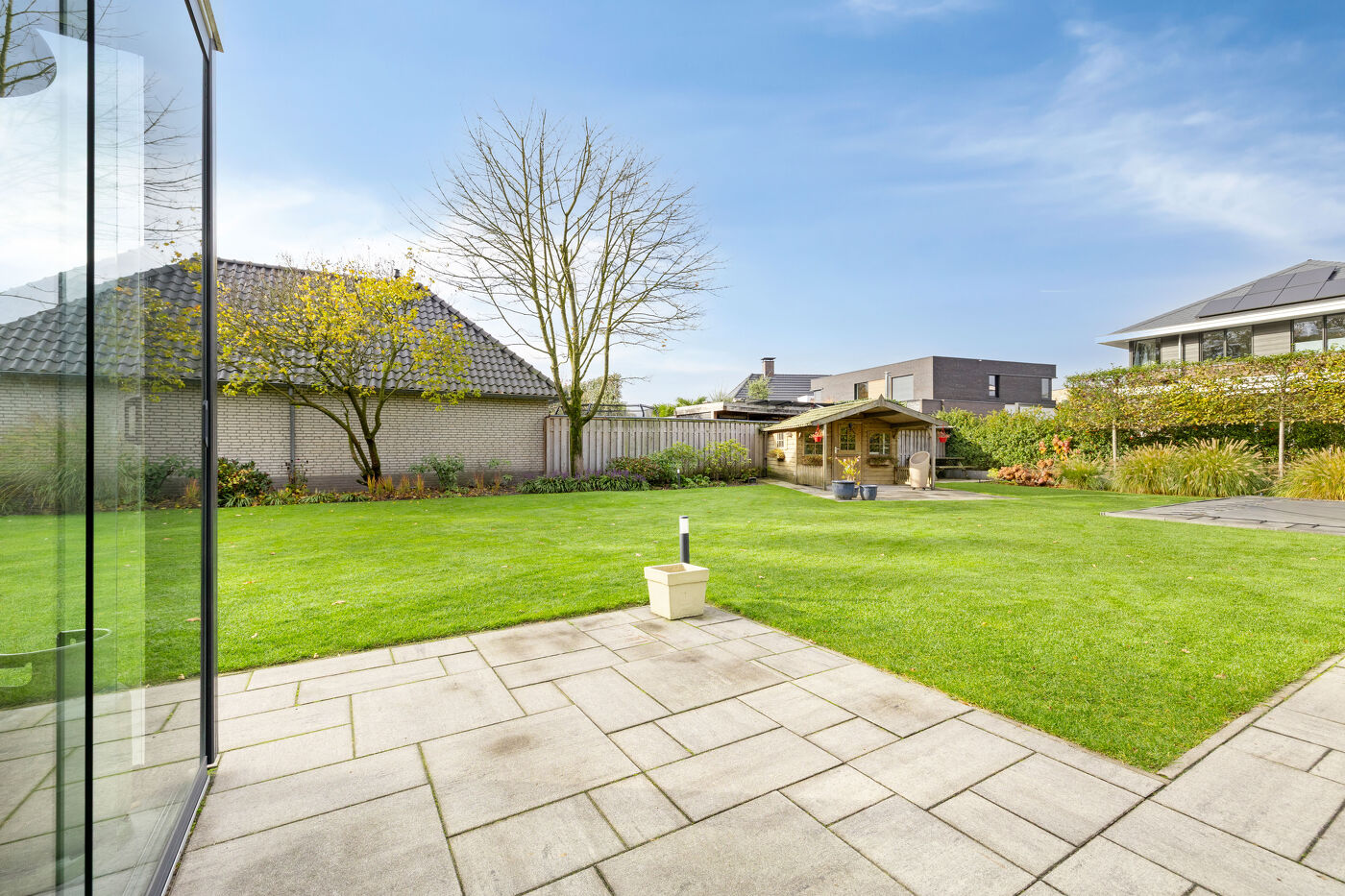 De tuin is netjes aangelegd en biedt veel rust en privacy. Het grote gazon wordt omringd door groene borders en een verzorgde erfafscheiding. Er is een ruime tuinkamer met glazen schuifwanden en lichtkoepels, waardoor je ook bij minder weer comfortabel buiten kunt zitten. Daarnaast zijn er nette terrassen met bestrating, een tuinhuis voor extra bergruimte en een mooi zwembad waar je in de zomer heerlijk kunt ontspannen.