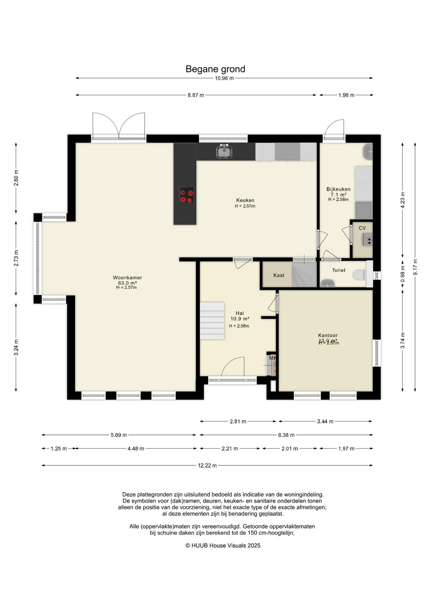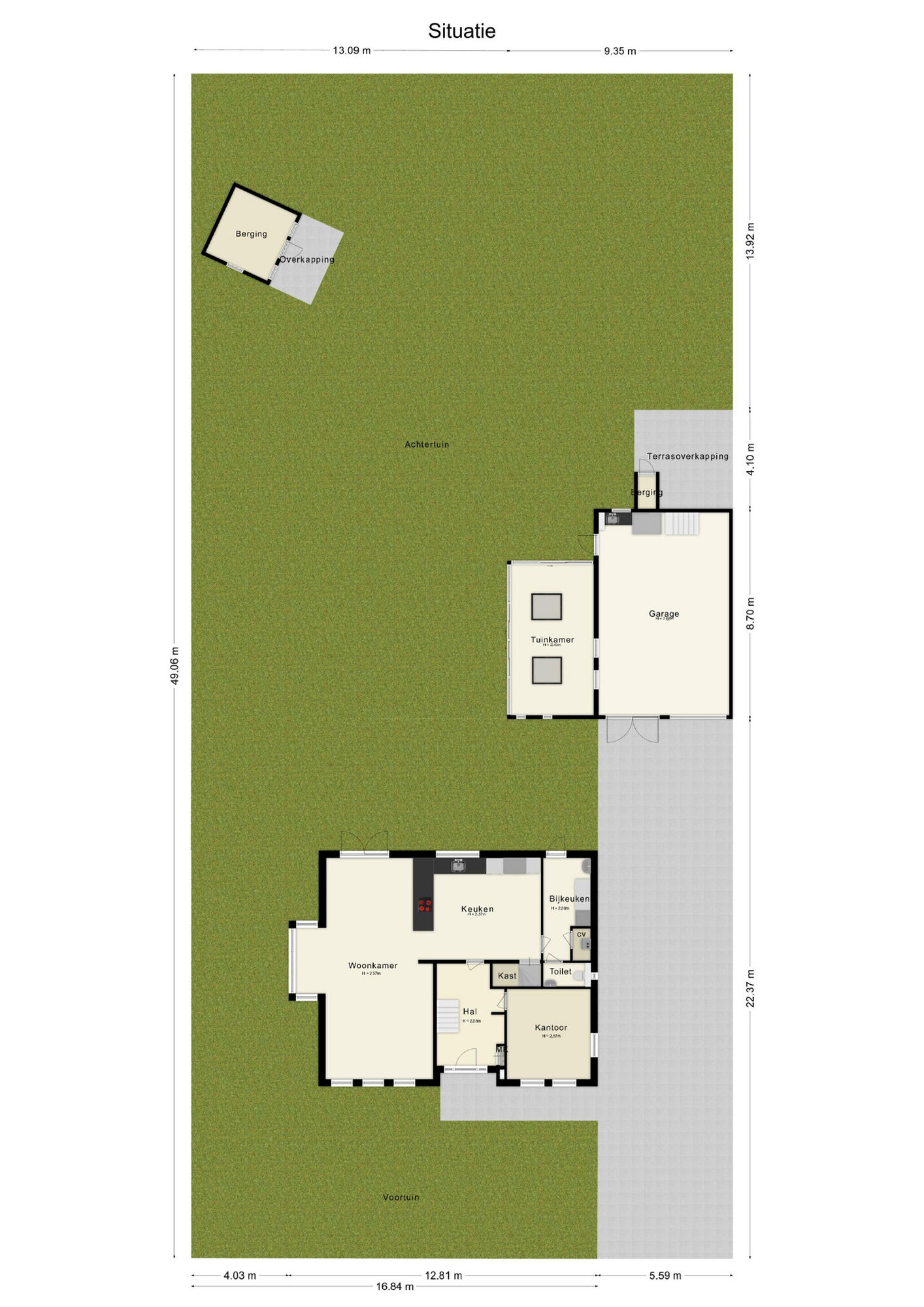 Begane grond Hal, meterkast, kantoor, keuken, woonkamer, bijkeuken, toilet
