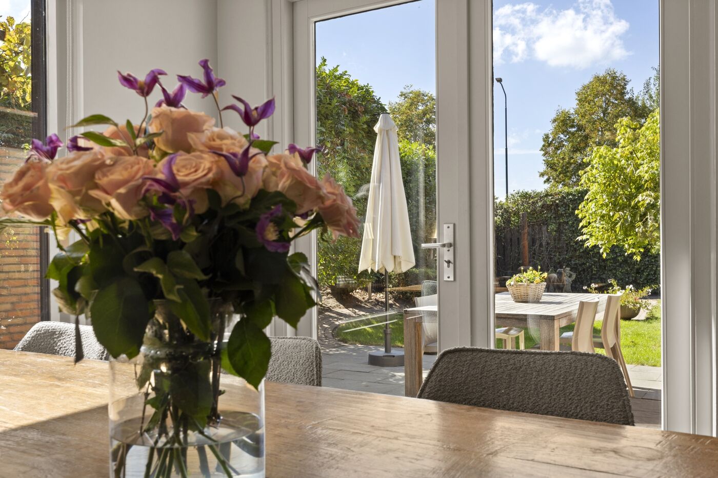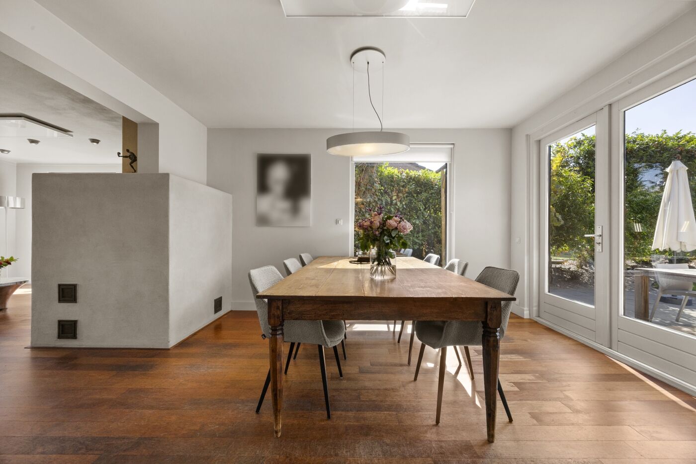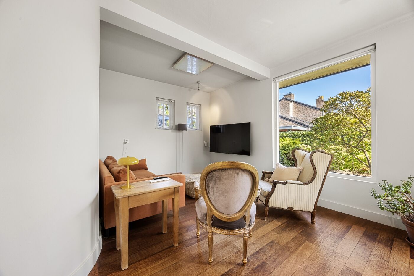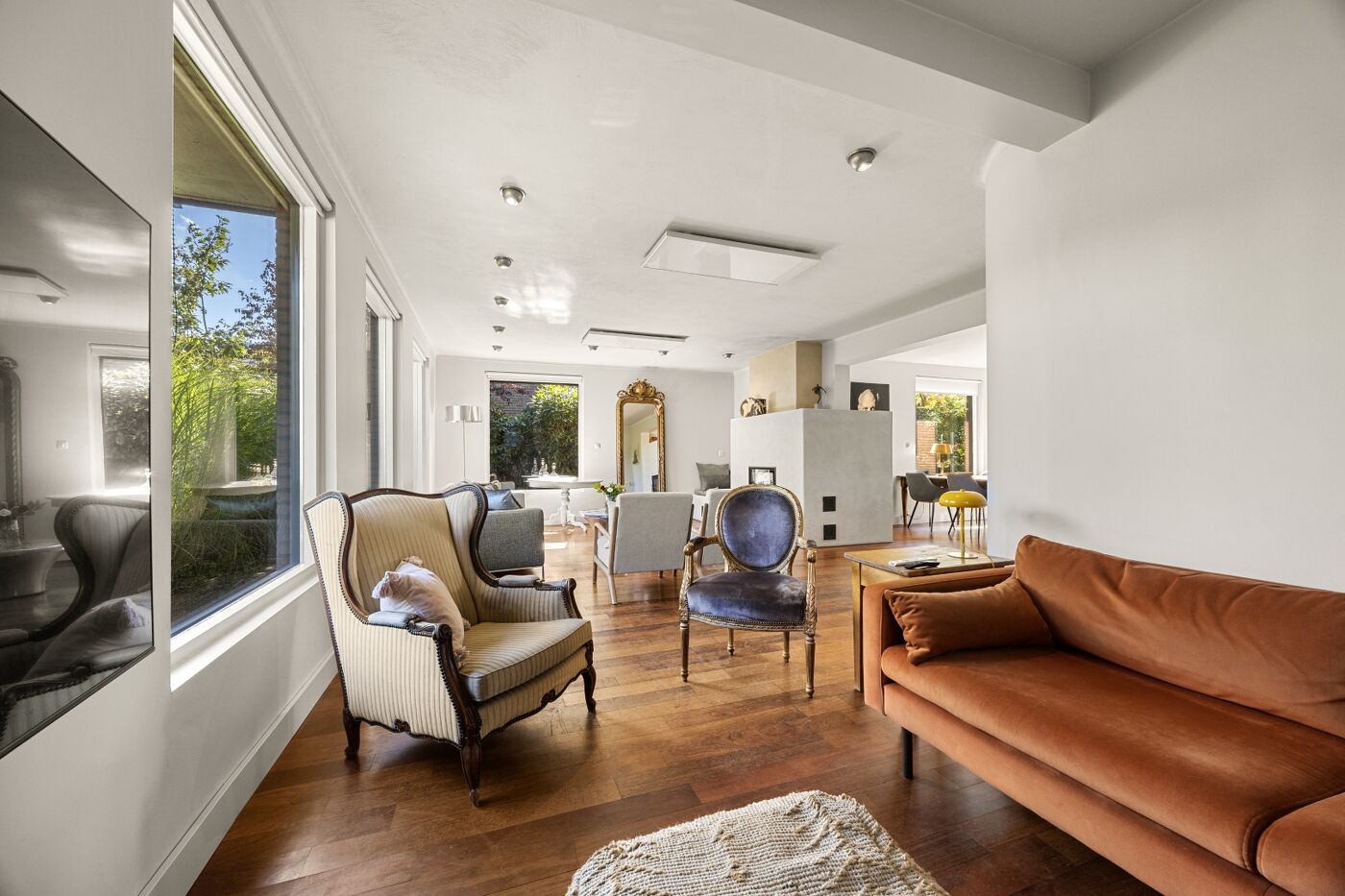 • Lichte woonkamer met grote raampartijen en uitzicht op de tuin
