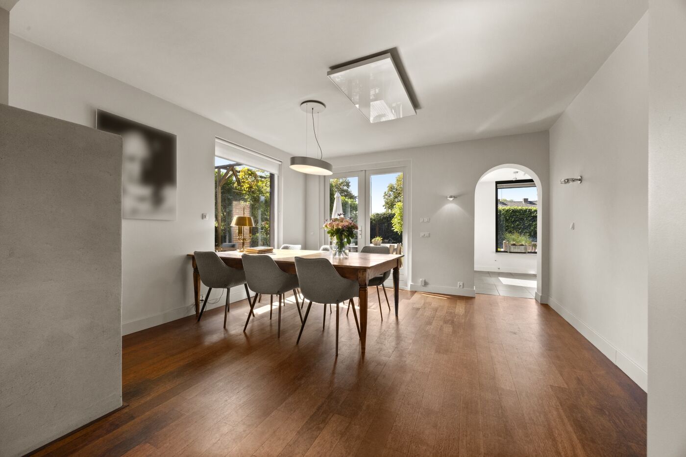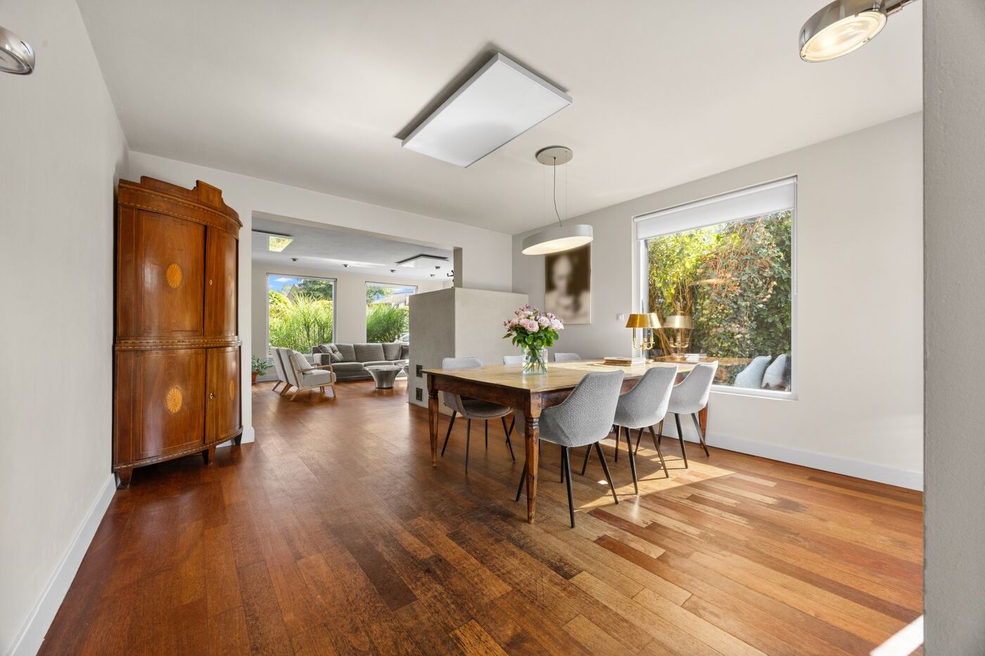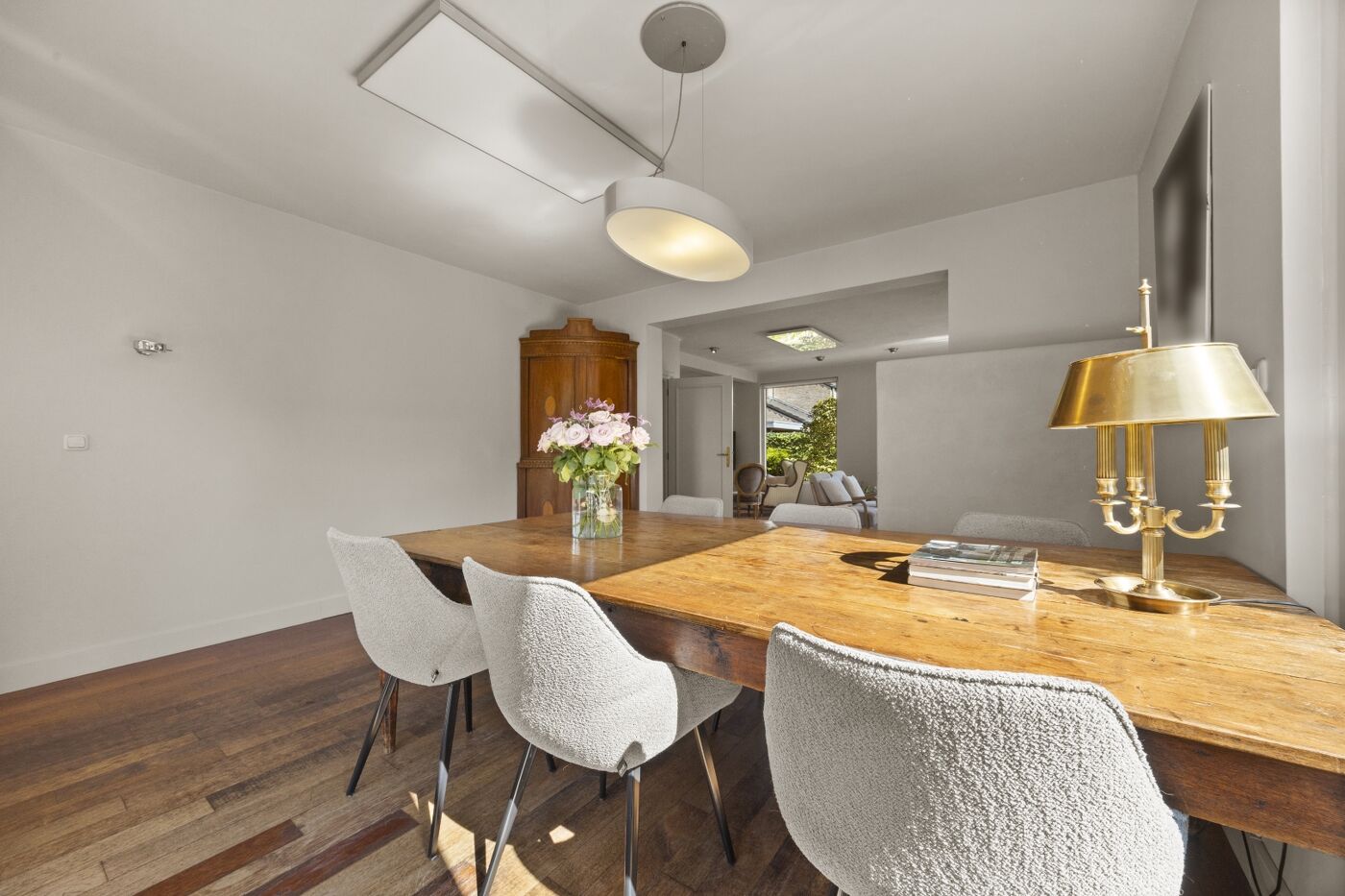 • Lichte woonkamer met grote raampartijen en uitzicht op de tuin