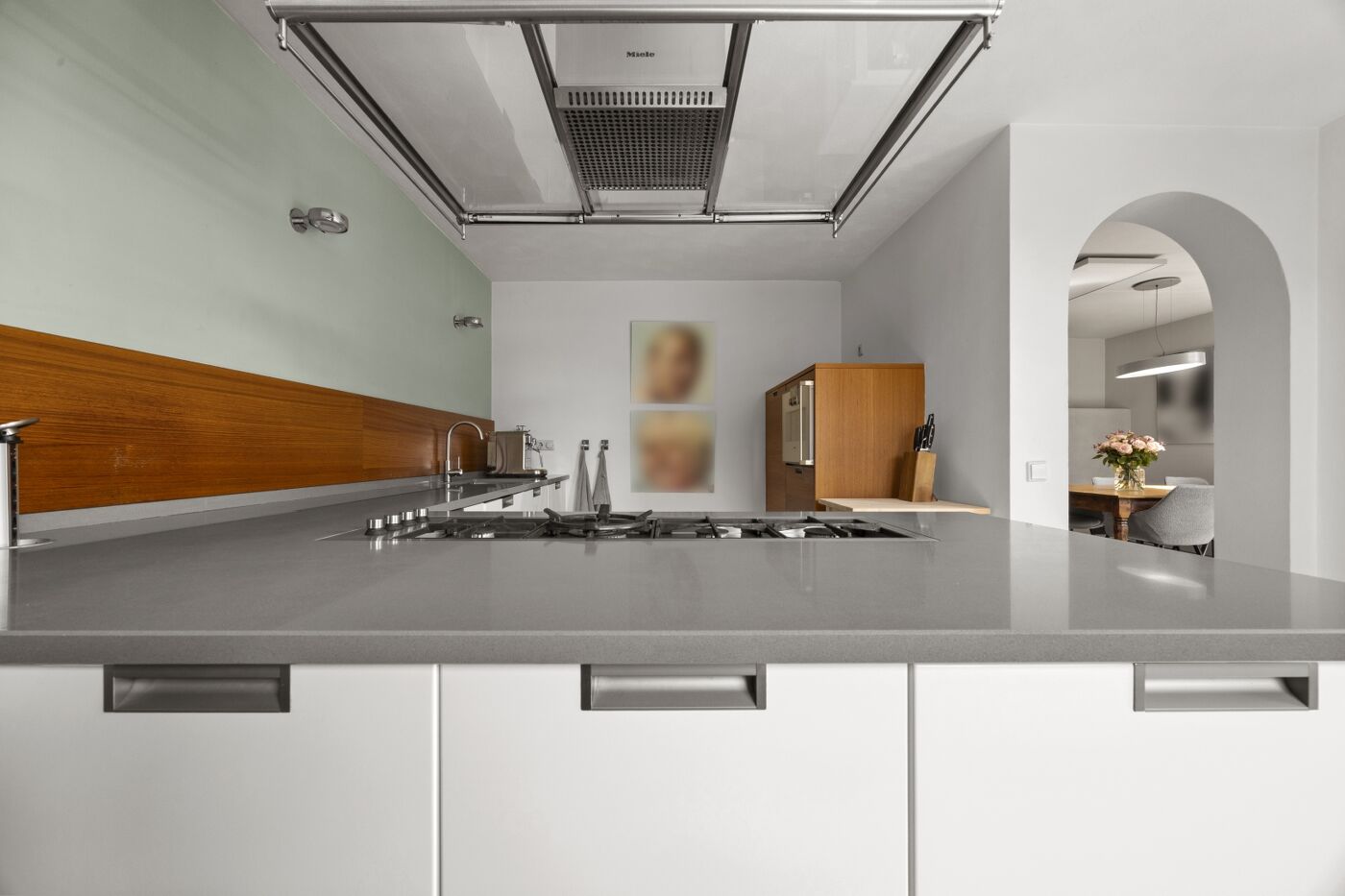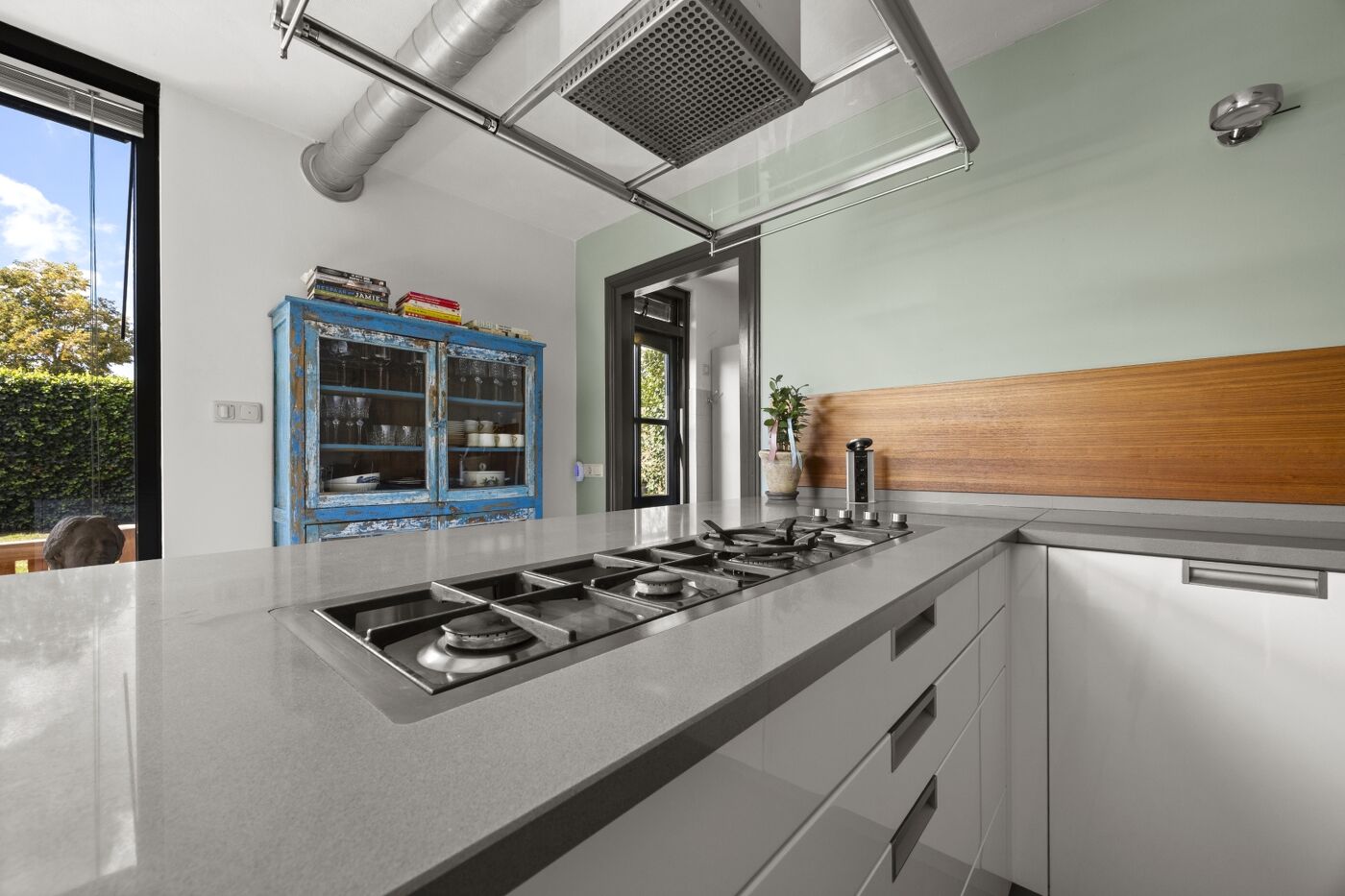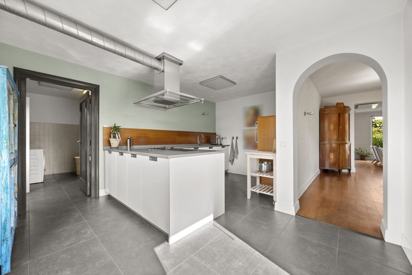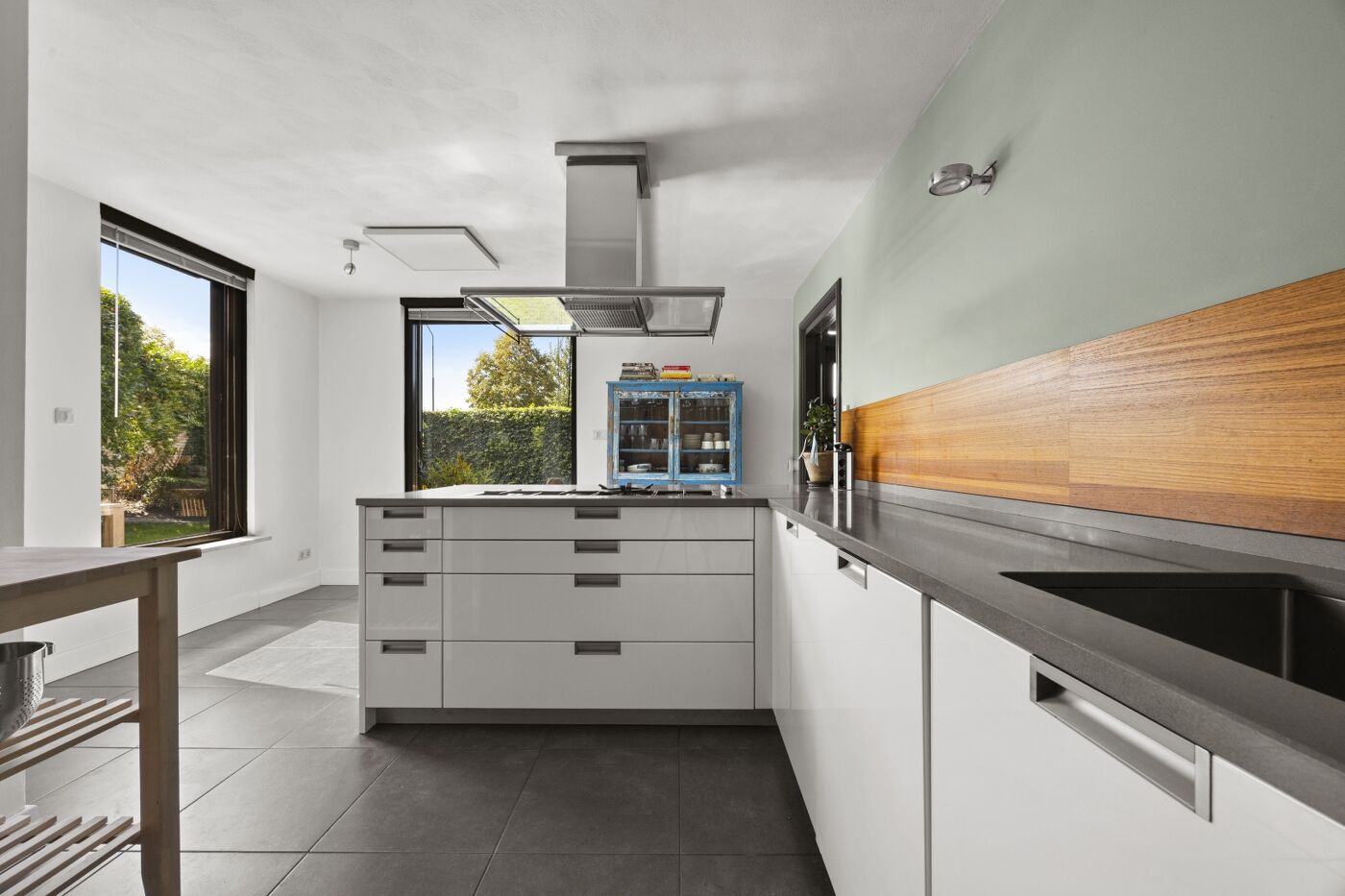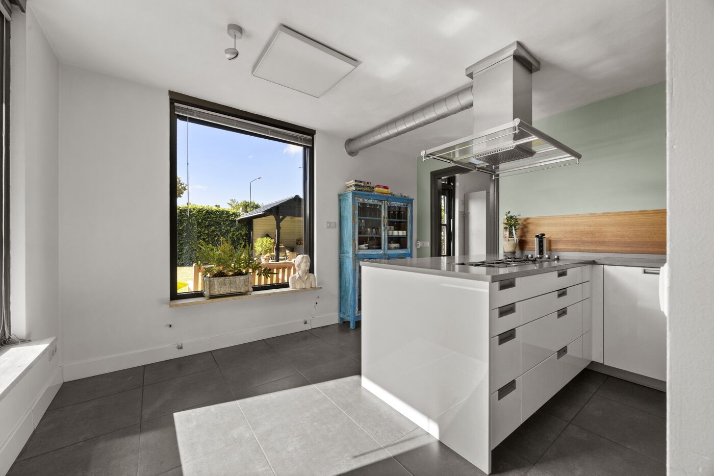 De keuken bevindt zich aan de achterzijde en is voorzien van een spoelbak, 4 pits gaskookplaat met afzuigkap, vaatwasser, ingebouwde combi/stoomoven en koelkast. Vanuit de keuken komt u in de bijkeuken met een deur naar de garage/berging met overkapping. Deze garage kan ook worden omgebouwd tot kantoor of speelruimte.