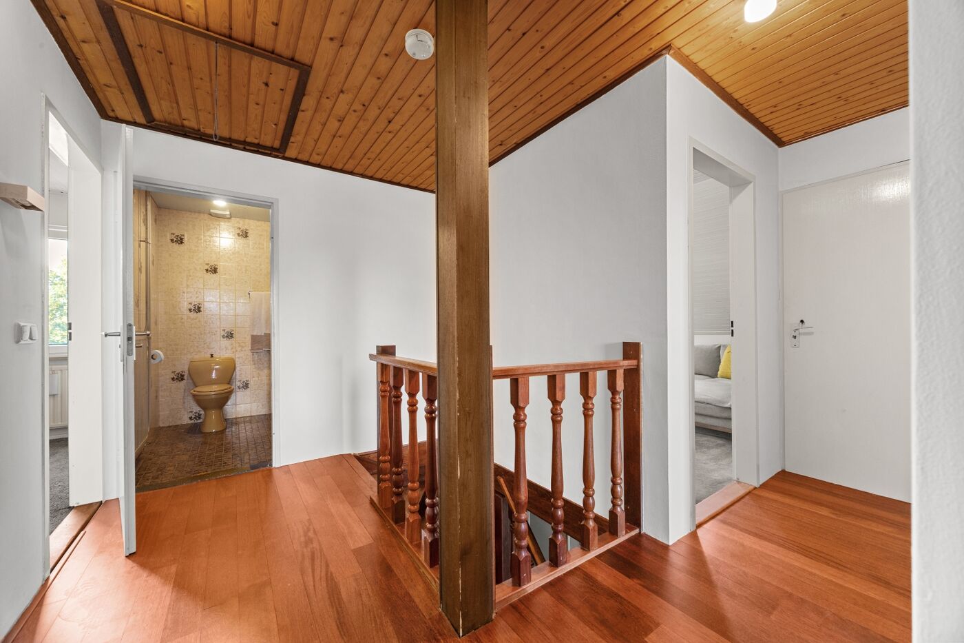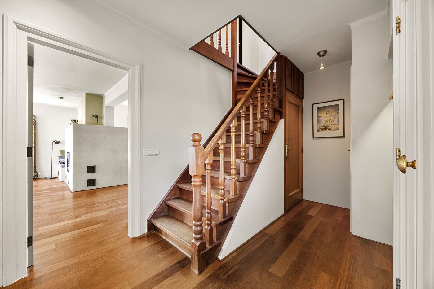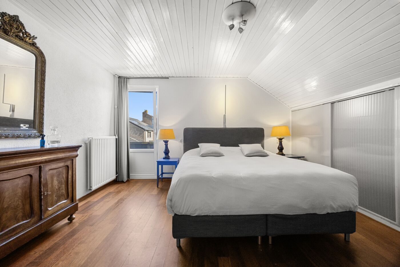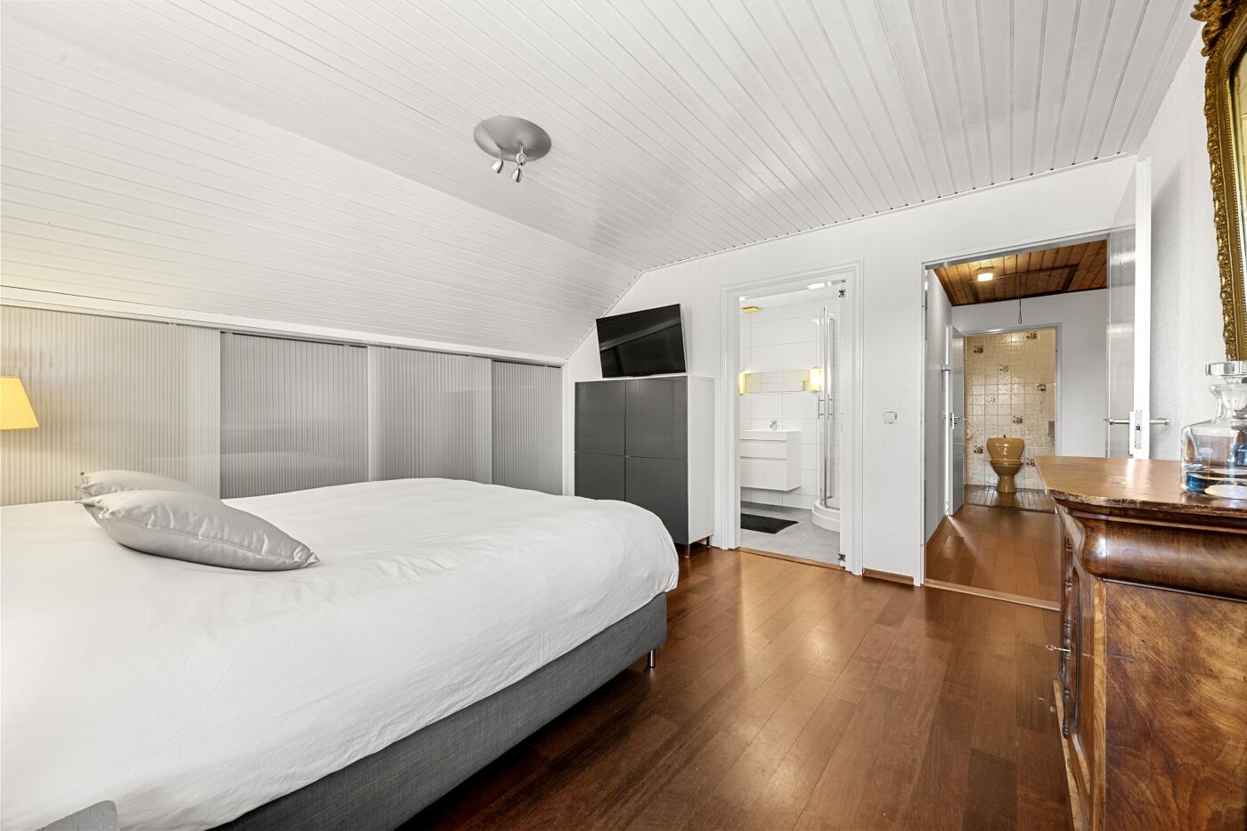 Overloop met houten vloer met aansluitend 4 slaapkamers met tussenruimte, twee badkamers en een vlizotrap naar de tweede verdieping (zolder). De hoofdslaapkamer is uitgerust met een houten vloer, een balkon aan de voorkant en een eigen badkamer. Alle ramen aan de achterzijde zijn ook hier voorzien van elektrische rolluiken.