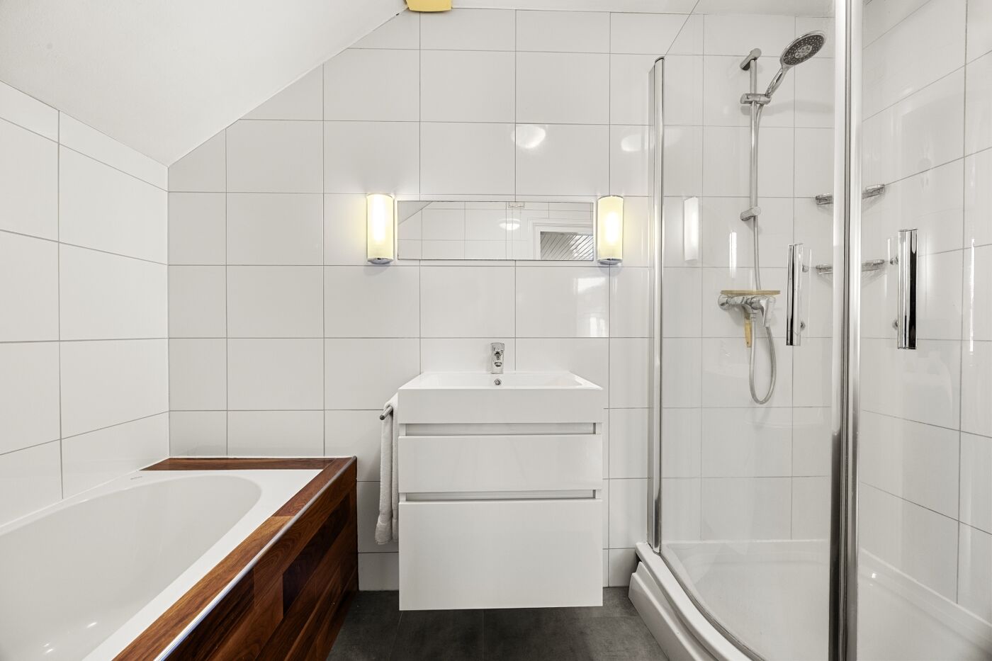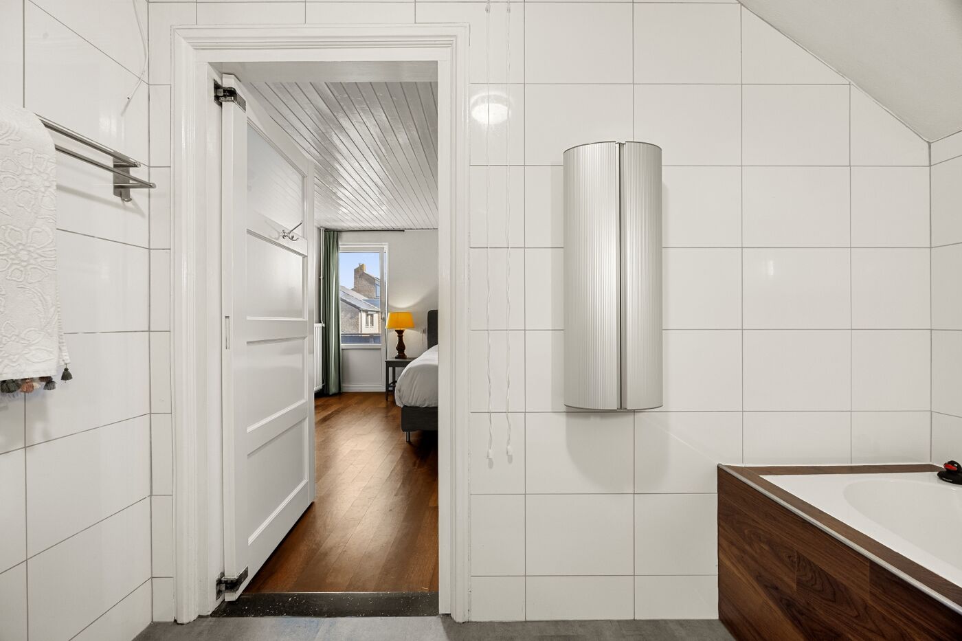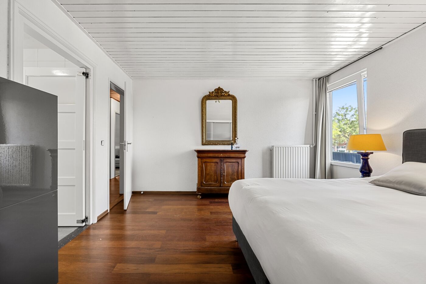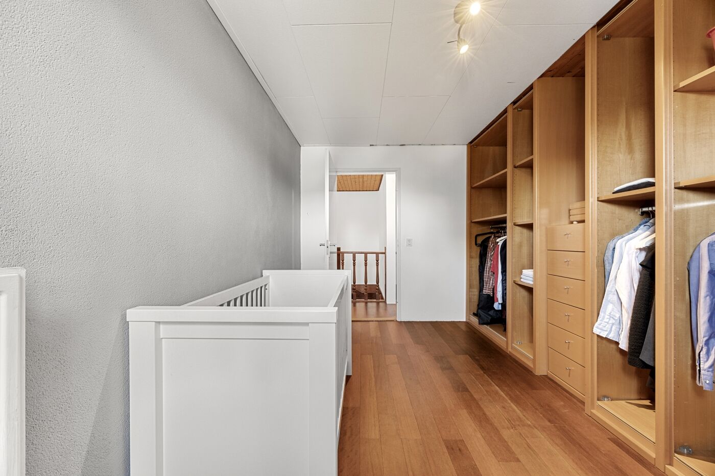 Overloop met houten vloer met aansluitend 4 slaapkamers met tussenruimte, twee badkamers en een vlizotrap naar de tweede verdieping (zolder). De hoofdslaapkamer is uitgerust met een houten vloer, een balkon aan de voorkant en een eigen badkamer. Alle ramen aan de achterzijde zijn ook hier voorzien van elektrische rolluiken.