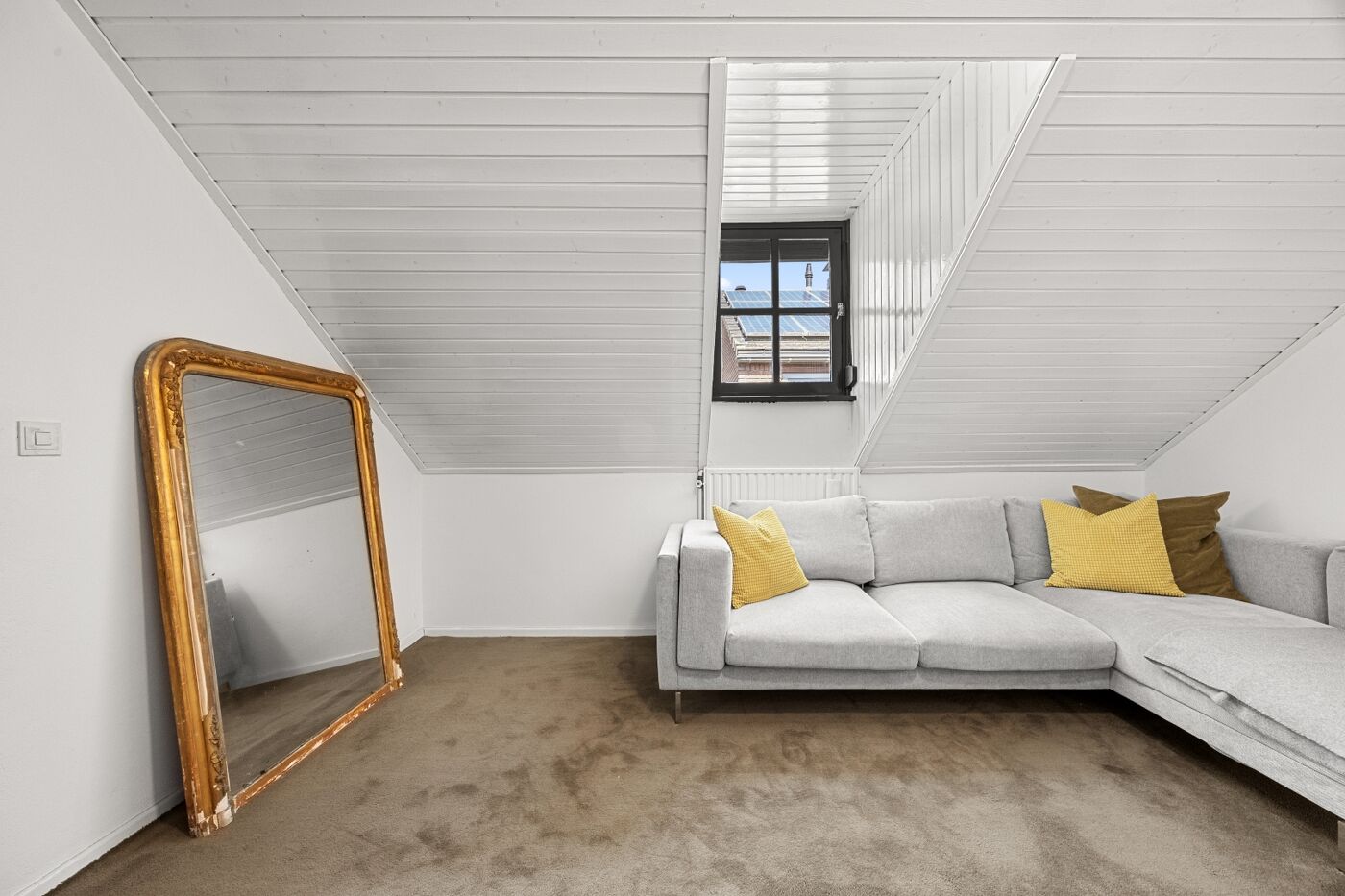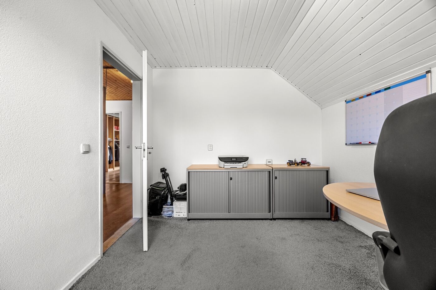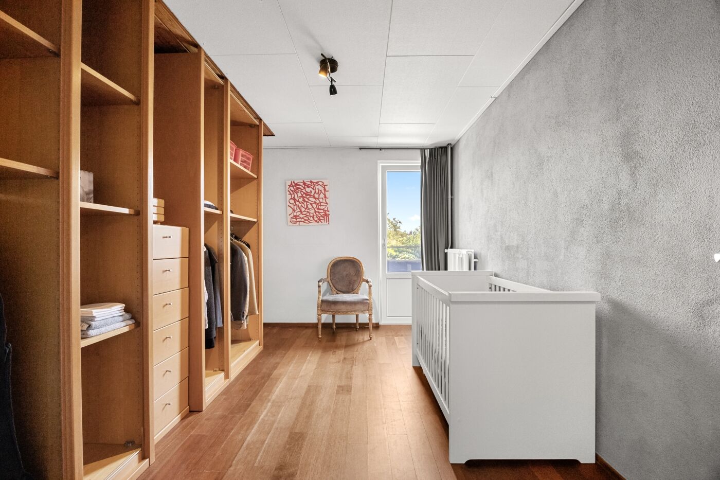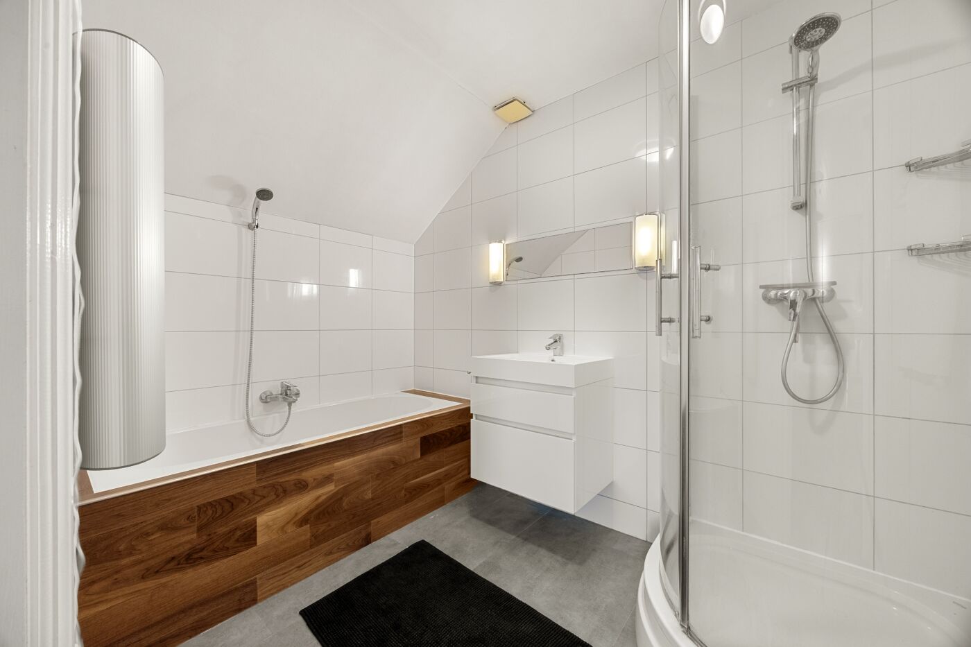 Overloop met houten vloer met aansluitend 4 slaapkamers met tussenruimte, twee badkamers en een vlizotrap naar de tweede verdieping (zolder). De hoofdslaapkamer is uitgerust met een houten vloer, een balkon aan de voorkant en een eigen badkamer. Alle ramen aan de achterzijde zijn ook hier voorzien van elektrische rolluiken.